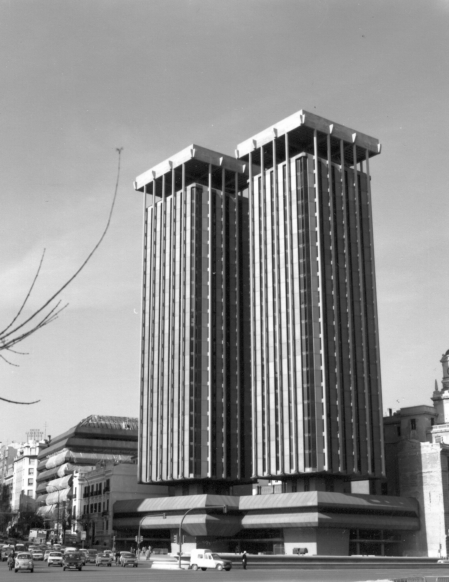 Se construyeron en 1967, de arriba a abajo, en contra de toda lógica, "la casa por el tejado". Poseen una estructura suspendida, el edificio está compuesto de dos grandes pilares unidos en lo alto por una plataforma (de la que cuelgan mediante grandes vigas perimetrales). El motivo de esta peculiar construcción reside en la licencia: solo había permiso para un edificio, y... la idea de Antonio Lamela lo hizo posible.