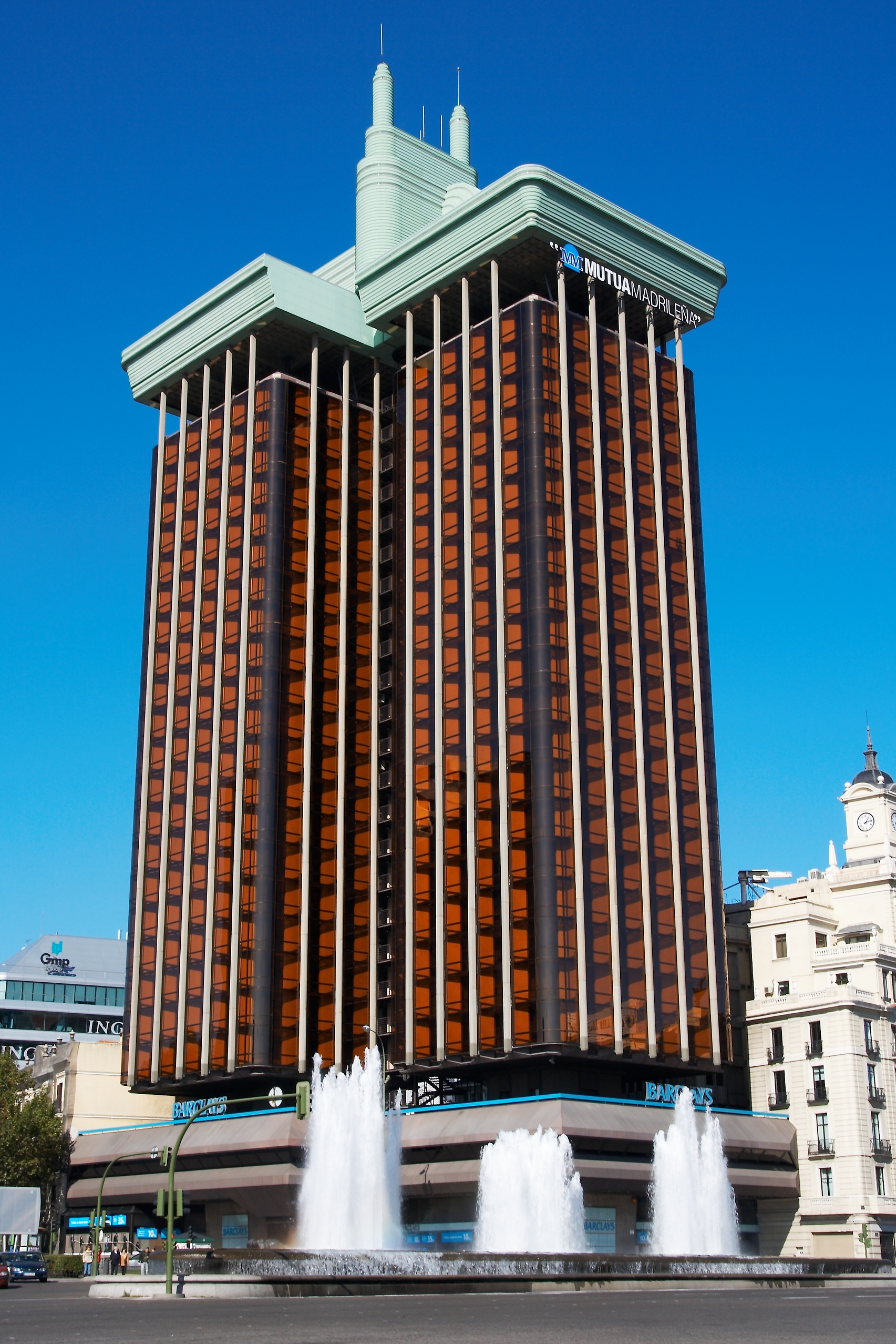 Posteriormente, en los años 1990, los cambios en la normativa de accesos y seguridad hicieron que se tuviera que instalar una escalera de emergencia, que se sitúo entre las torres. Se aprovechó para recubrirlas por una segunda capa de cristal de color granate. En el centro, que es donde terminan, se añadió el famoso "enchufe" art déco, para ocultar las antenas y demás maquinaria.