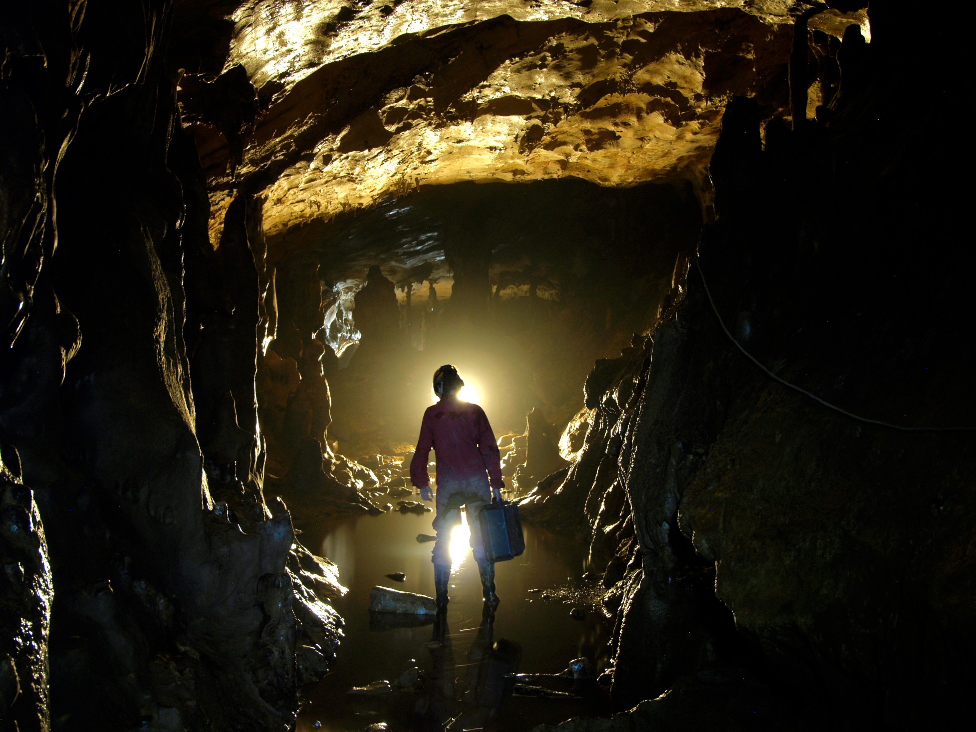 Cueva del Reguerillo (Patones, Madrid) Vista de la galería superior desde la entrada, parcialmente inundada por fugas de agua de las conducciones del Canal de Isabel II. 2007