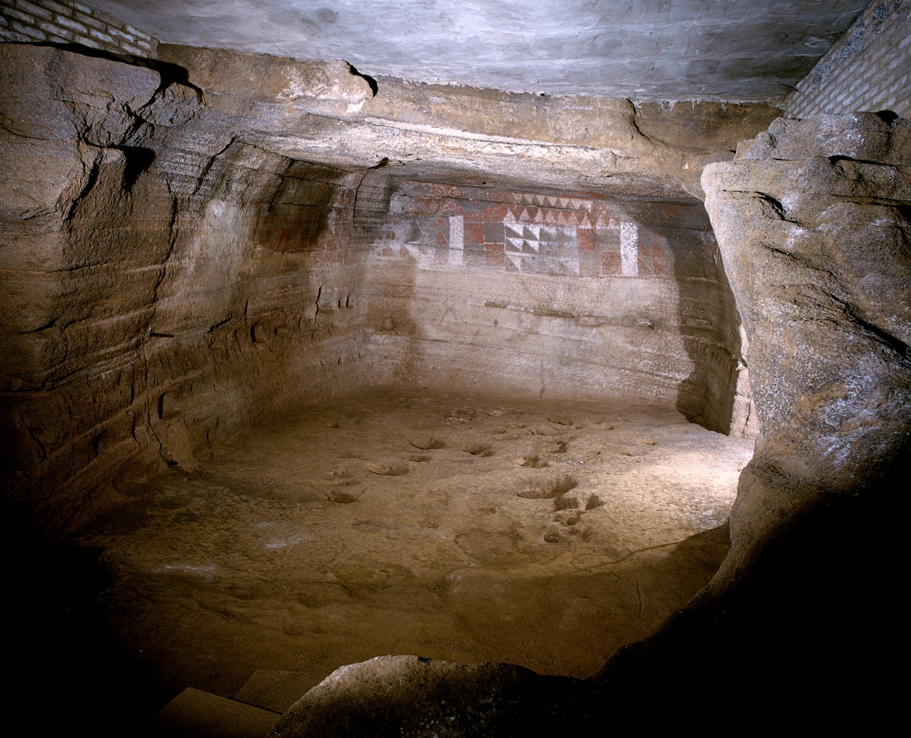 Cueva Pintada de Gáldar (Gran Canaria), decorada con una gran variedad de motivos geométricos (círculos, cuadrados, triángulos, etc.) pintados en rojo y blanco. 1988