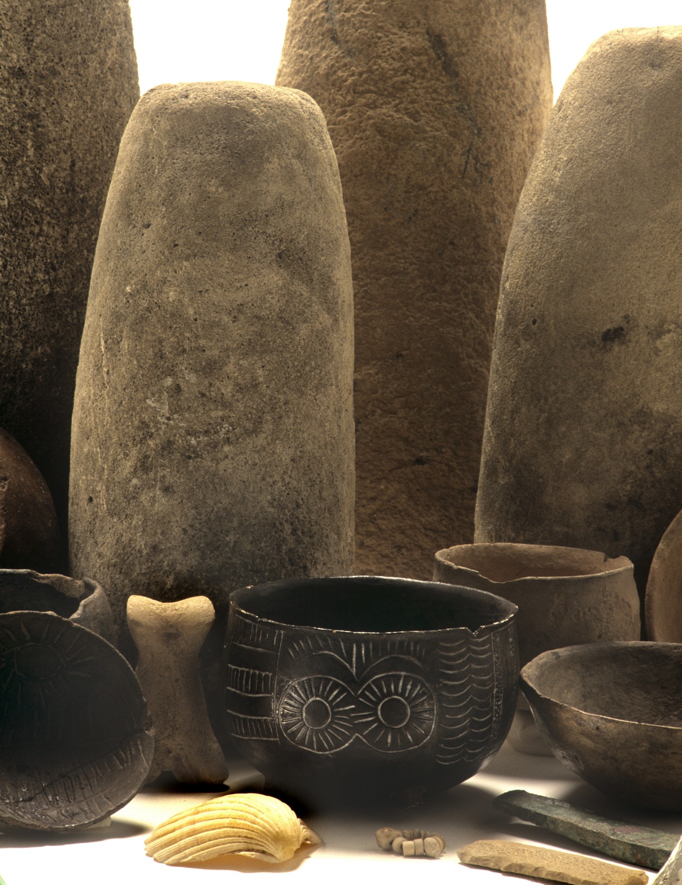Conjunto de materiales (cerámicas simbólicas, objetos de adorno, ídolos betilo y tolva) procedente de Los Millares (Santa Fe de Mondújar, Almería), uno de los yacimientos más representativos del calcolítico peninsular. 1997