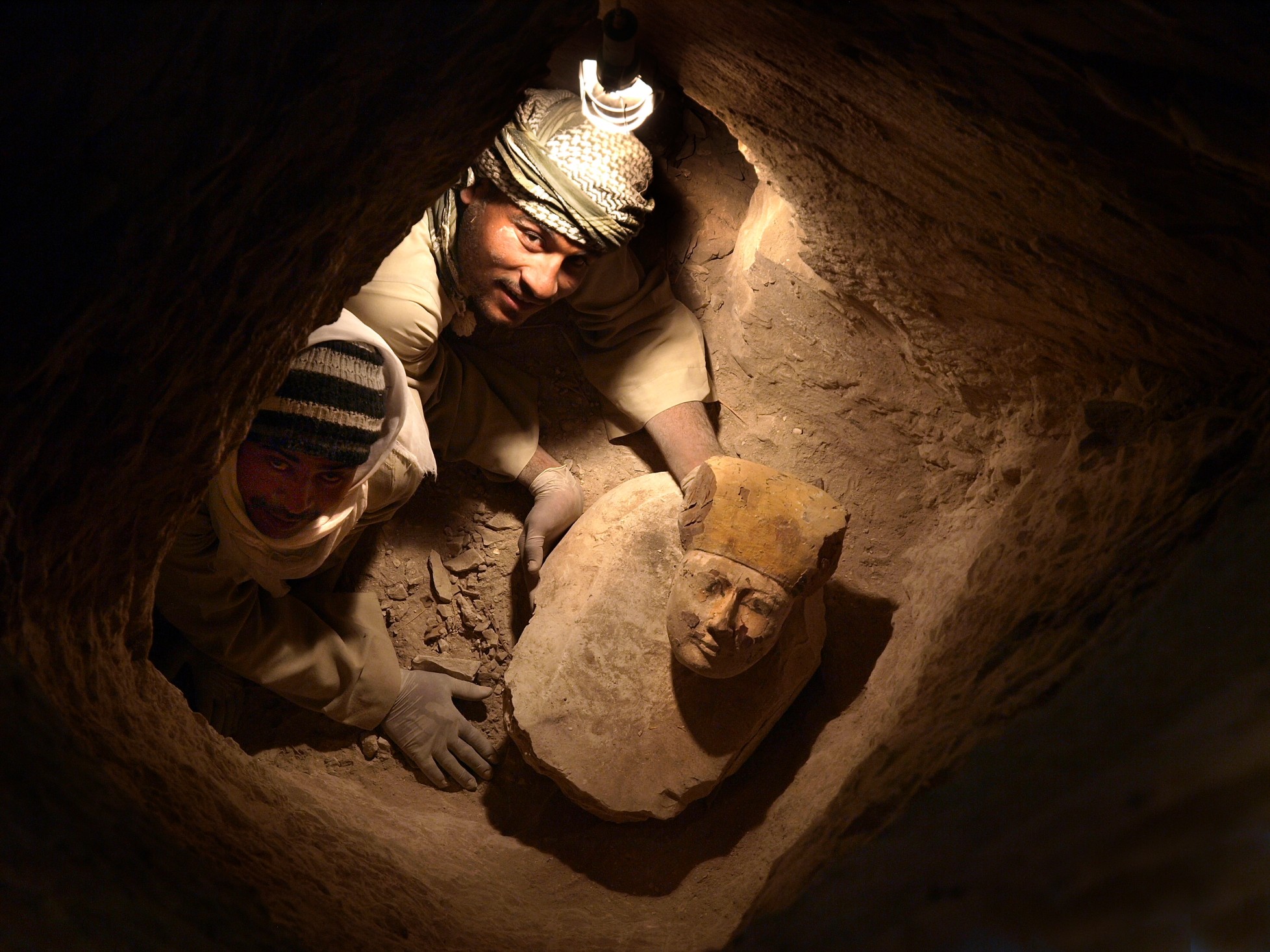 Hallazgo de una máscara de ataúd en uno de los pozos funerarios del interior de la tumba de Hery, en Draa Abu el Naga (Luxor, Egipto). 2012