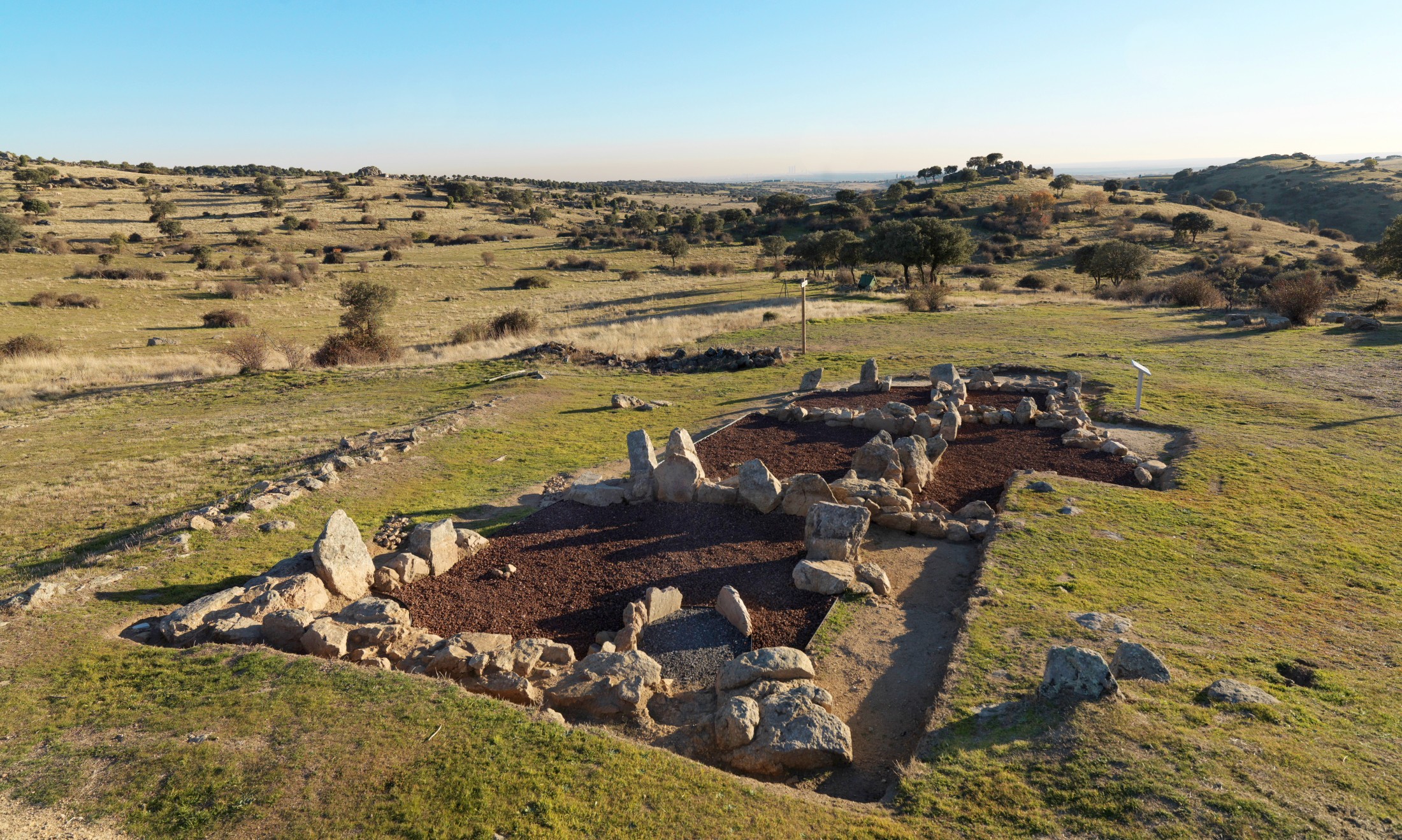 Vista general de una vivienda y las estancias artesanales musealizadas de la aldea visigoda de Navalahija (Colmenar Viejo, Madrid).2013.