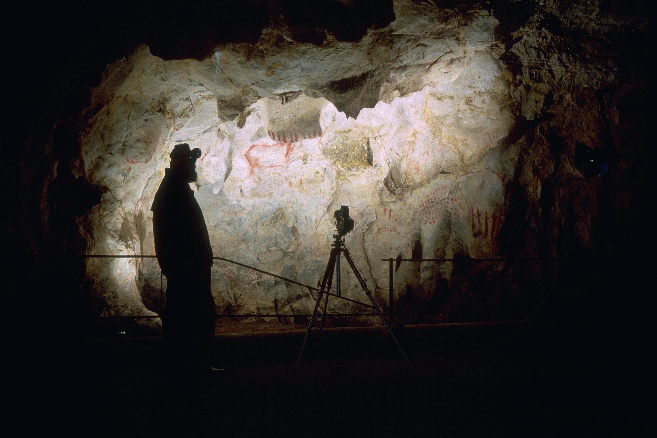 Cueva del Pindal (Pimiango, Asturias).Contraluz. Imagen del panel principal con representaciones figurativas de una cierva contorneada y crestones de la roca circundante con líneas y puntuaciones en rojo. Inventario nacional de Arte Rupestre.1987.