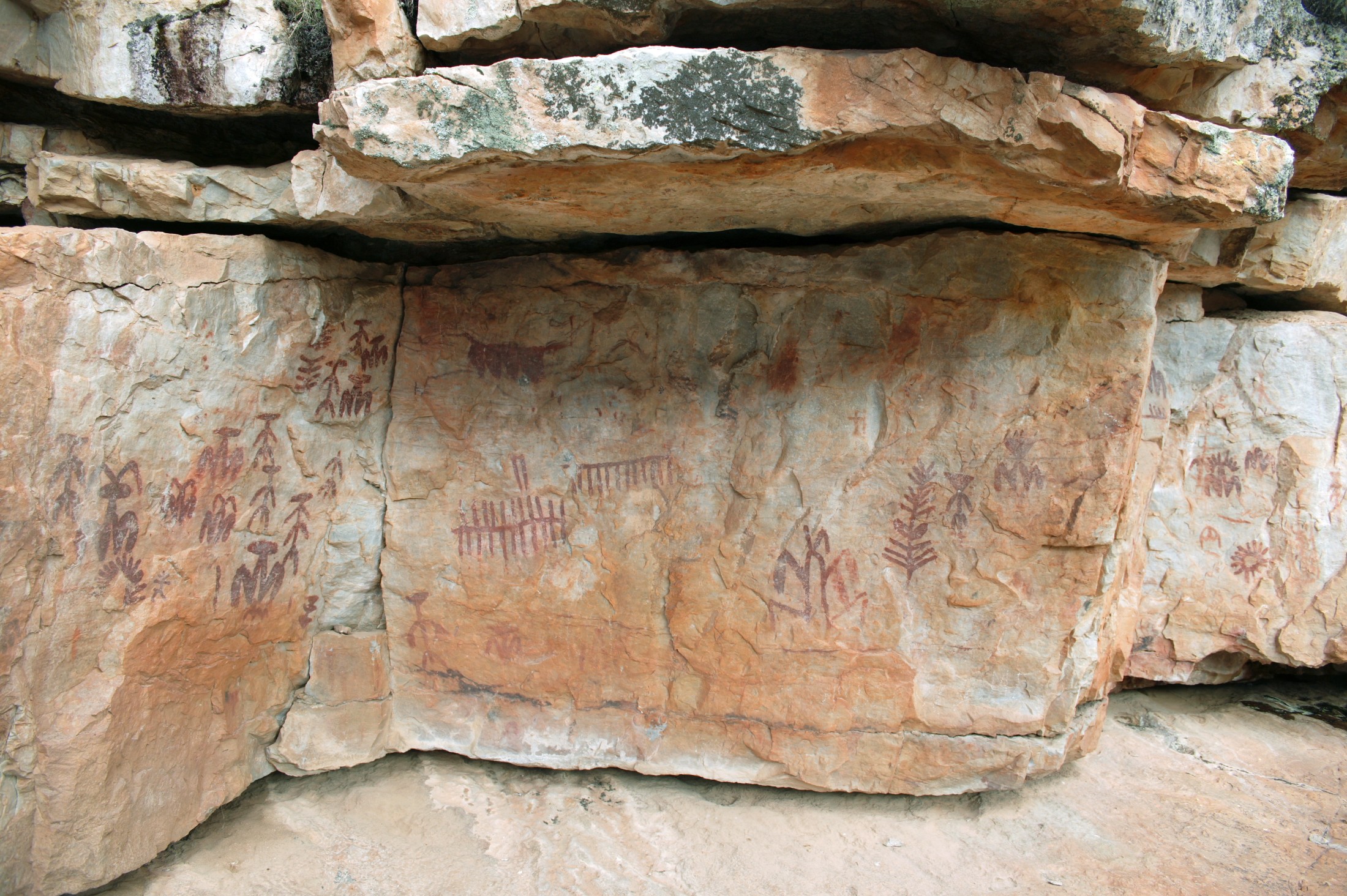 Abrigo de Peñaescrita (Fuencaliente, Ciudad real). Vista parcial de la estación rupestre. Sobre las paredes de cuarcita se localizan decenas de signos y figuras zoomorfas y antropomorfas esquemáticas pintadas en rojo y agrupadas en ocho paneles.2010.