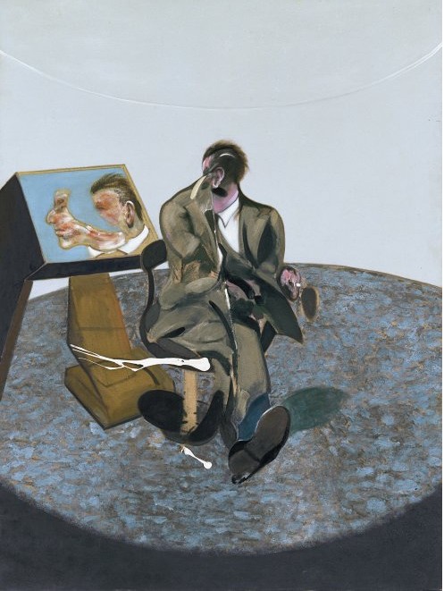 También hay obras de Francis Bacon, pintor que, en el plano amoroso, solía tener aventuras con hombres mayores, con los que establecía relaciones de poder altamente tóxicas. Este componente dramático queda plasmado en los múltiples retratos que hizo de sus amantes, como el Retrato de George Dyer en un espejo.