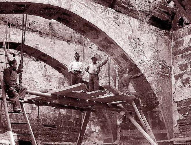 En el mes de agosto de 1936, tras ser quemado el monasterio por las milicias anarquistas llegadas de Cataluña, Josep Gudiol, famoso marchante de arte llegó con una orden de la Junta de Museos de Barcelona "para proteger las pinturas". Las arrancó y se las llevó a su taller, desde donde pasaron al Museo de Arte de Cataluña, actual MNAC.