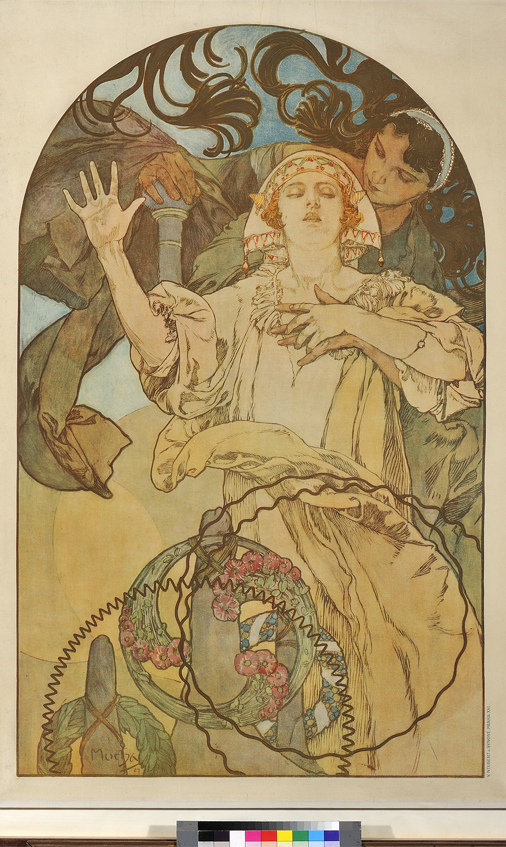Entre las piezas que componen la muestra, el público encontrará pinturas comoAutorretrato (1899), carteles como el póster para Gismonda (1894) o el de Sarah Bernhardt como La Princesse Lointaine (1896) así como Francia abraza a Bohemia.