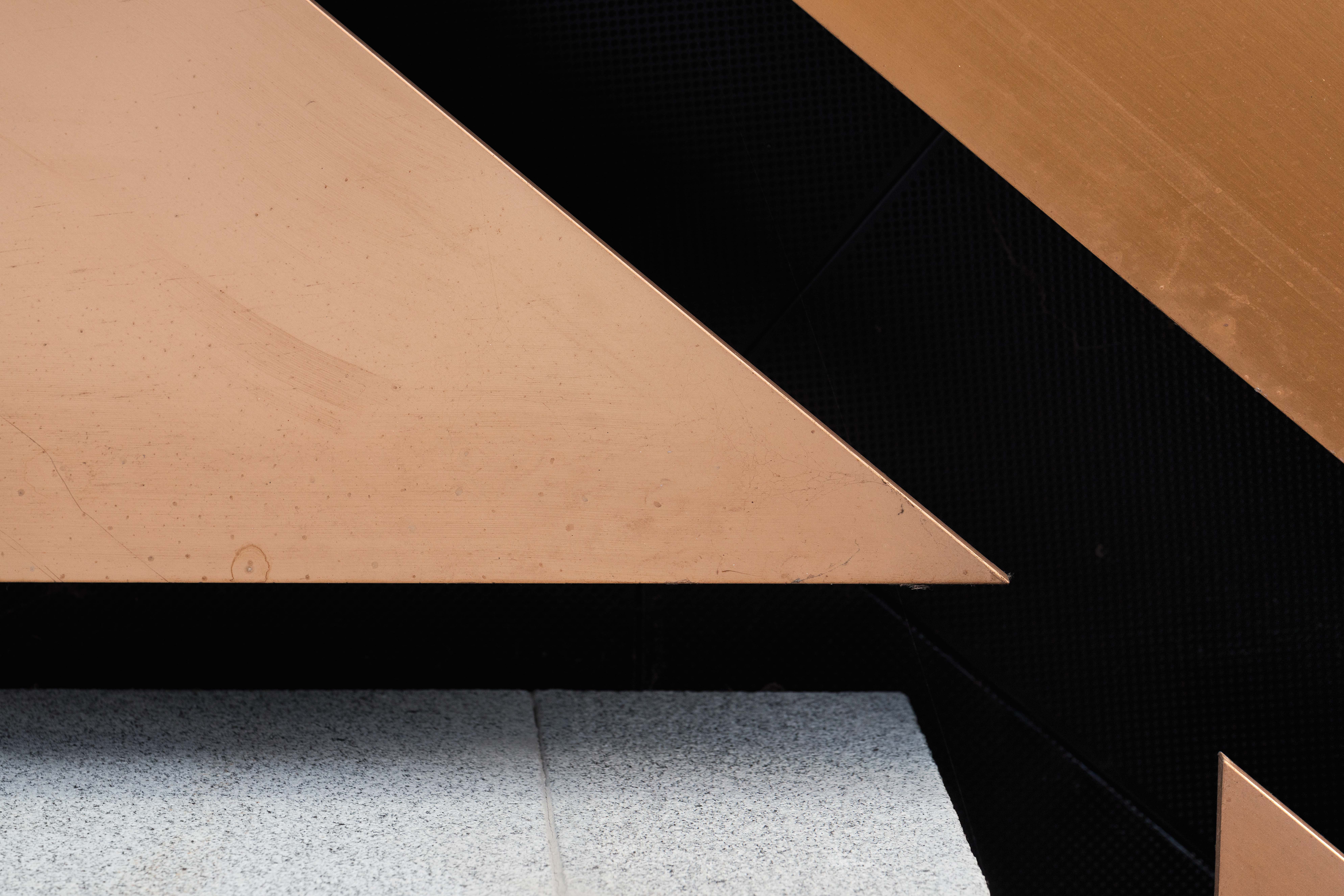 Nido de ángulos. Techo con granito y vértices de los paneles chapados en bronce. Entrada de la Puerta de los Jerónimos. Fotografía de Joaquín Berchez. 2017