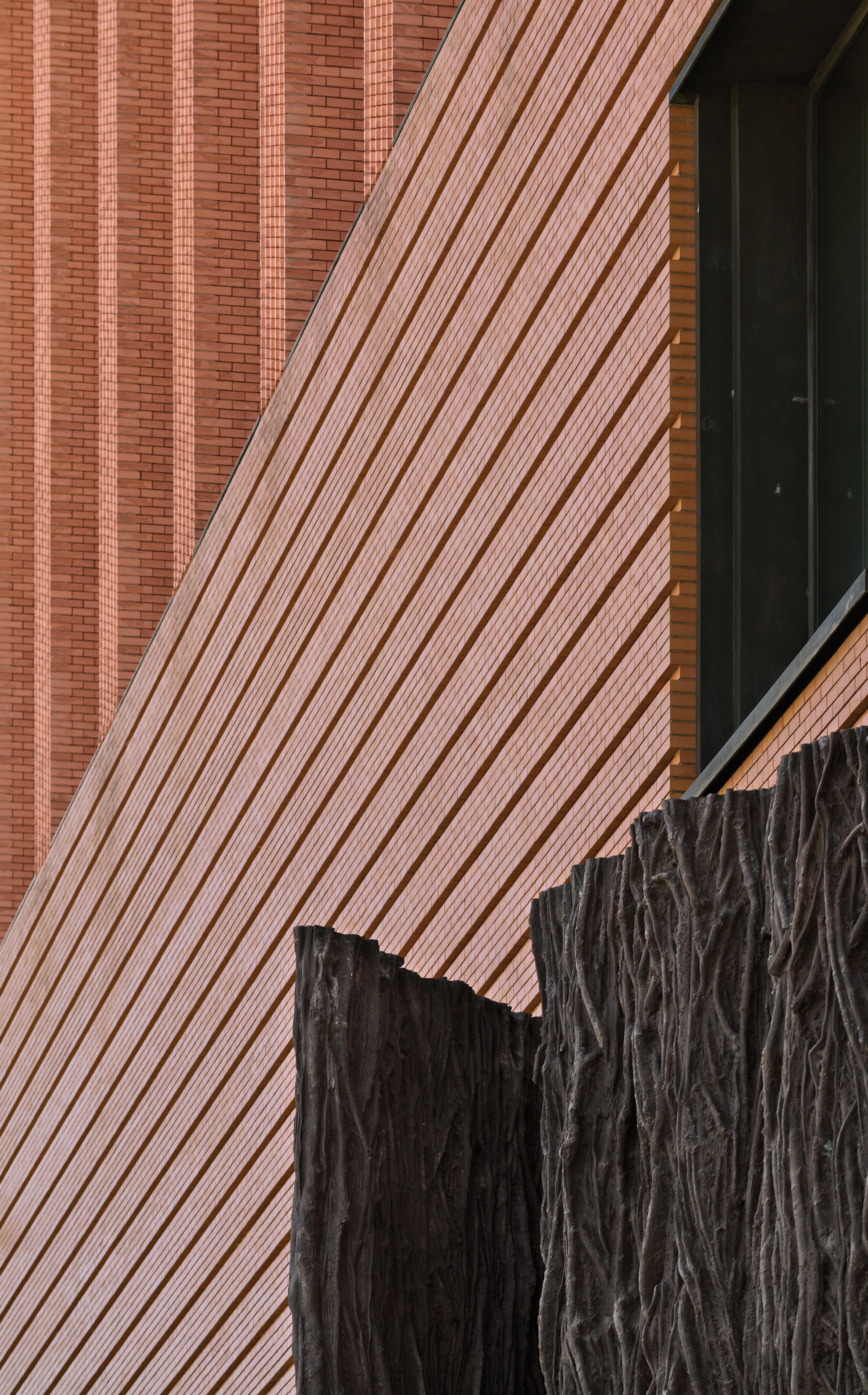 A vueltas con los orígenes de la arquitectura. Puerta leñosa en bronce de Cristina Iglesias, muro llagado de ladrillo aplantillado y logia de pilares áticos. Fotografía de Joaquín Berchez.