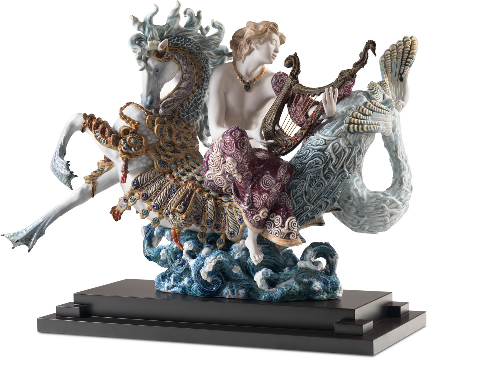 ARIÓN CON CABALLO DE MAR es una de las piezas más destacadas del catálogo \"Fantasía Marina\". Es obra de Francisco Polope y se lanzó al mercado en el año 2011 en una serie limitada de 500 piezas. Mide 62x77 cm y su precio alcanza los 15.500 euros.