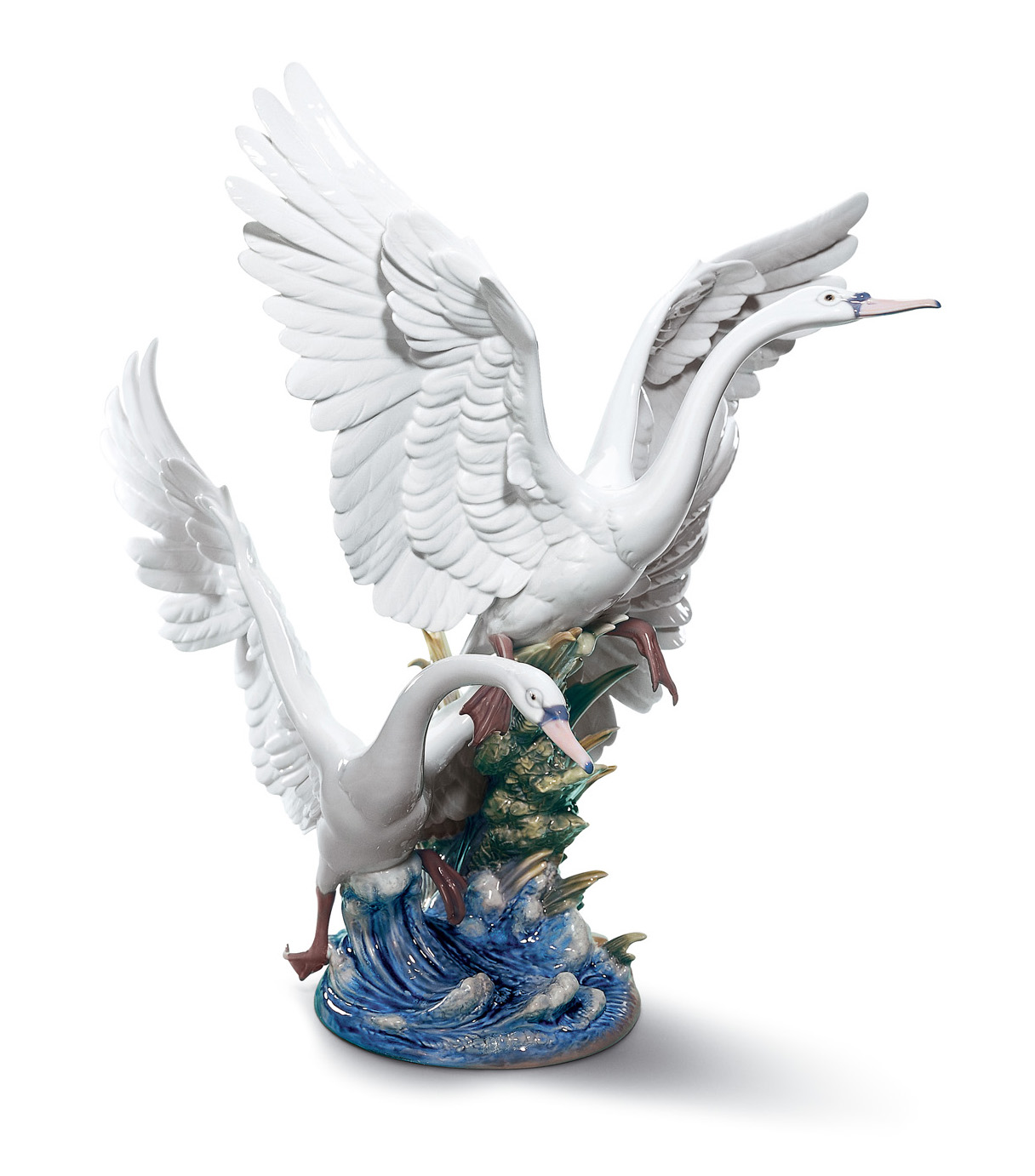 VUELO DE CISNES es obra del escultor Salvador Debón, lanzada al mercado en el año 1992. Mide 65x70 cm y cuesta 2.900 euros.