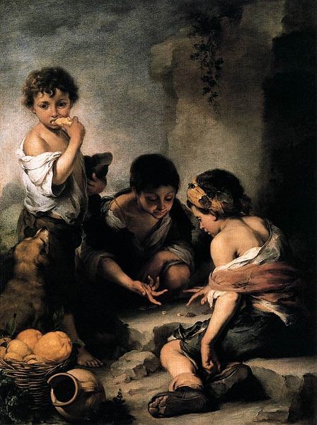 Murillo los pinta descansando, quitándose las pulgas, comiendo, jugando o contando las monedas que acaban de ganar. Niños solos, trabajadores (ojo, no mendigos) y contentos, que siempre me han hecho pensar más en Tom Sawyer y Huckleberry Finn que en Lázaro de Tormes o en el Buscón don Pablos. Zarrapastrosos y felices, como los de Mark Twain, los de Murillo se retiran a lugares solitarios para comer lo que pillan, disfrutando con deleite de un pastel, unas uvas o un melón, pero también de un simple trozo de pan.