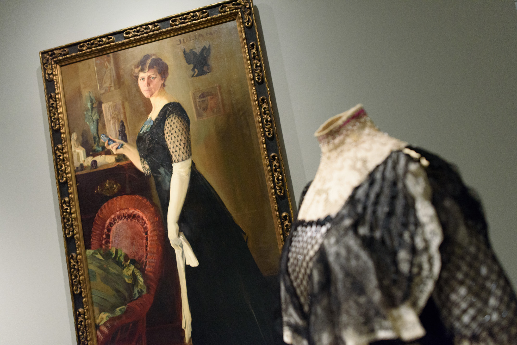 Obra: Jualianna Armour Ferguson, 1909, de Joaquín Sorolla y Bastida. Vestido de 1905, tul y gasa de seda, cordón metálico.