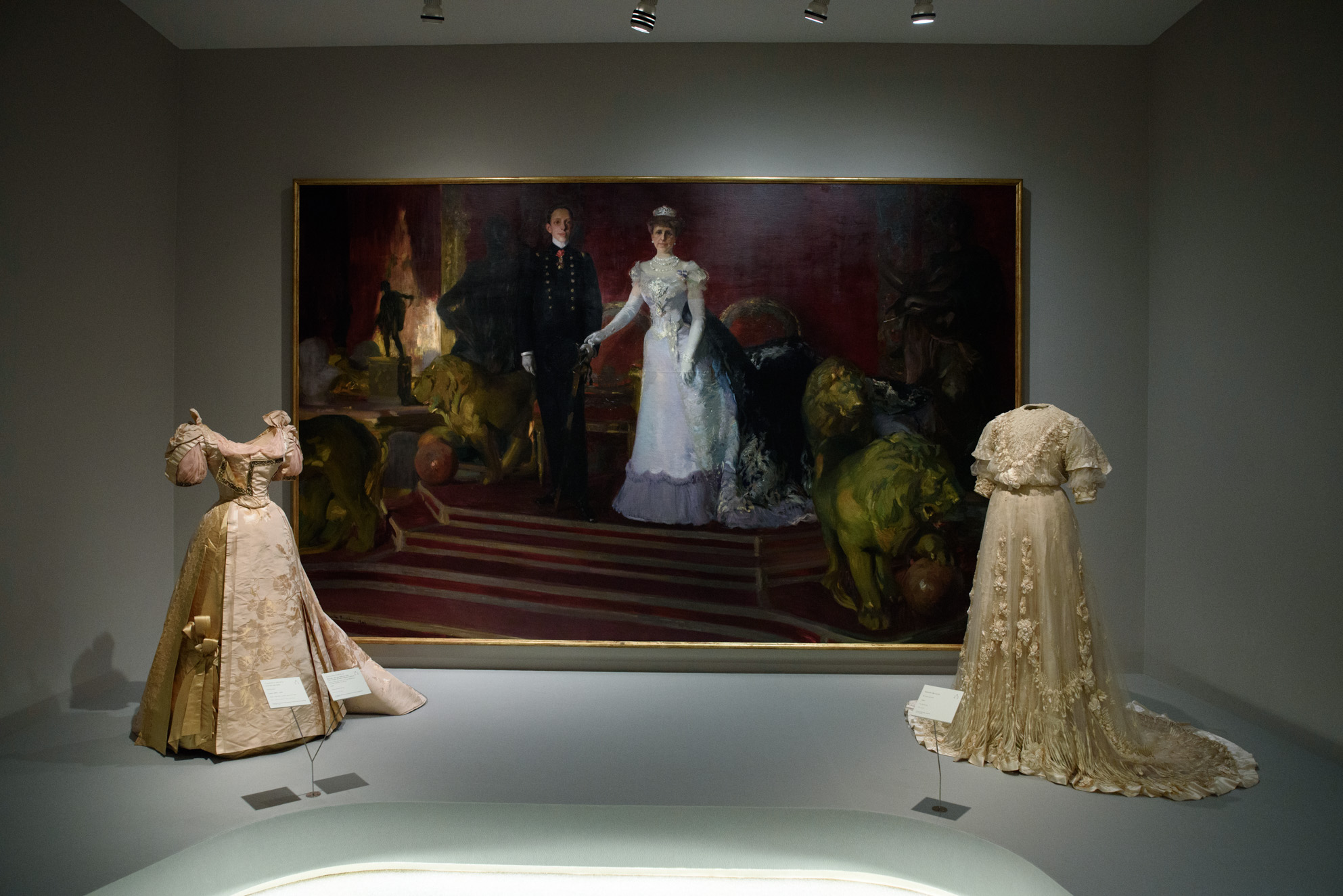 Obra: Retrato del rey Alfonso XIII y su madre la reina María Cristina, 1901, de Joaquín Sorolla y Bastida. Vestido (derecha) de novia de tul de seda.