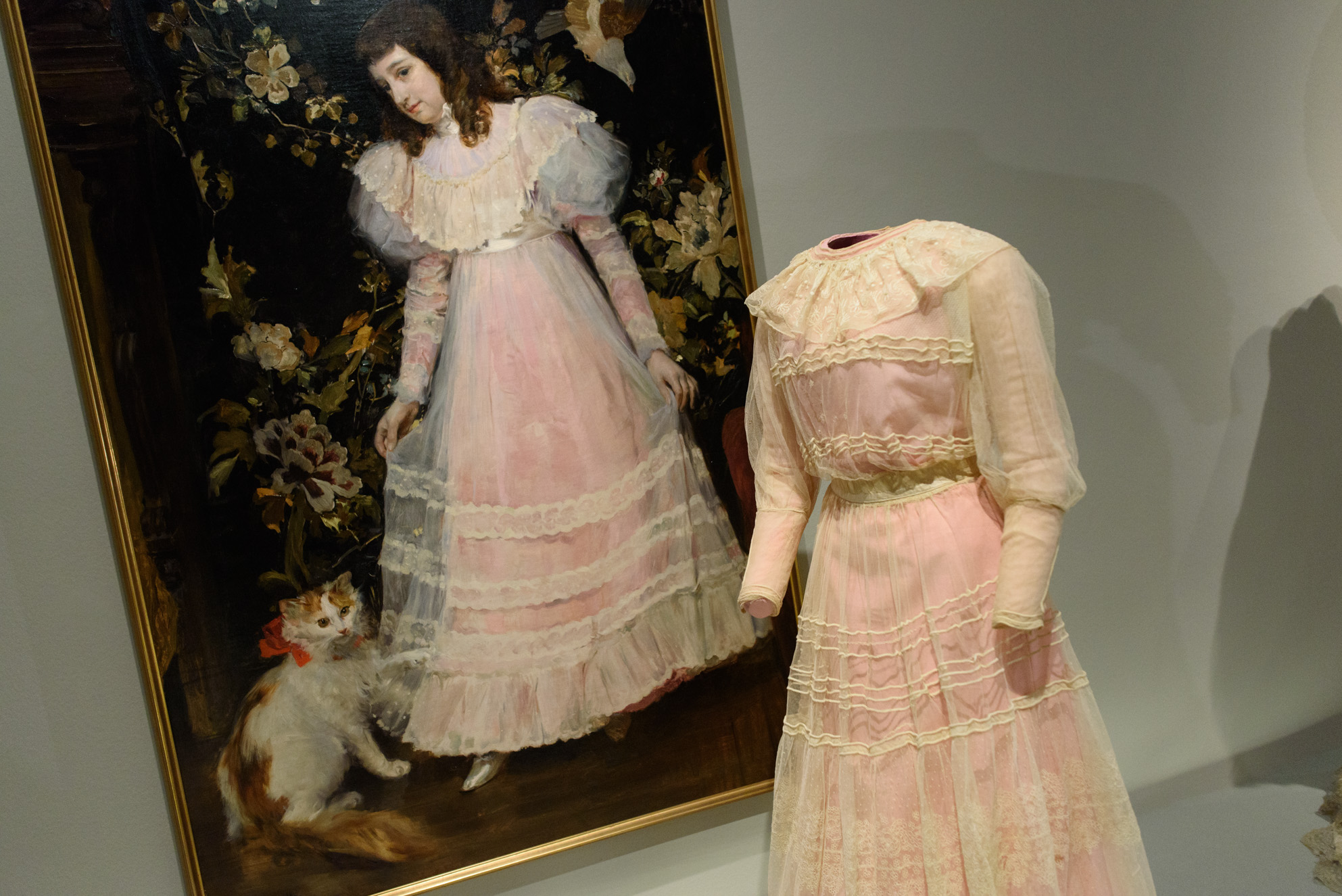 Obra: La señorita Barrios con su gato, 1895, de Joaquín Sorolla y Bastida. Traje: Tul de algodón y seda.