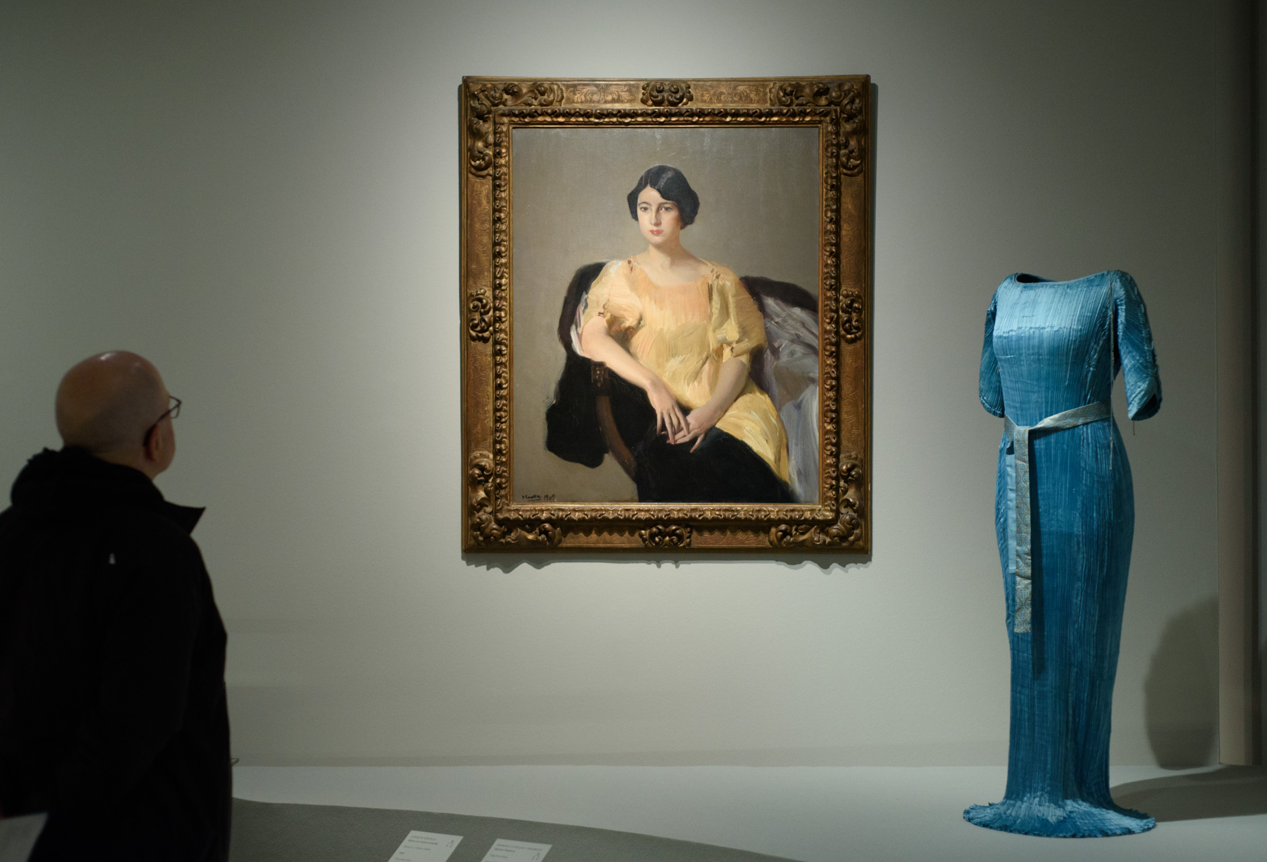 Obra: Elena con túnica amarilla, 1909, de Joaquín Sorolla y Bastida. Vestido: Delphos, de Mariano Fortuny, tefatatán de seda y cristal de Murano.