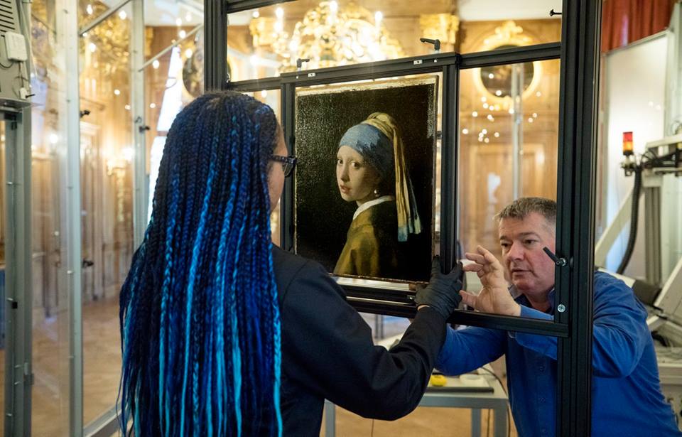 Varios expertos examinan la famosa Joven de la perla (1665), del pintor holandés Johannes Vermeer.