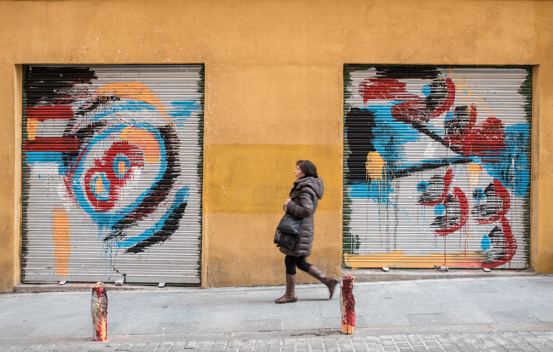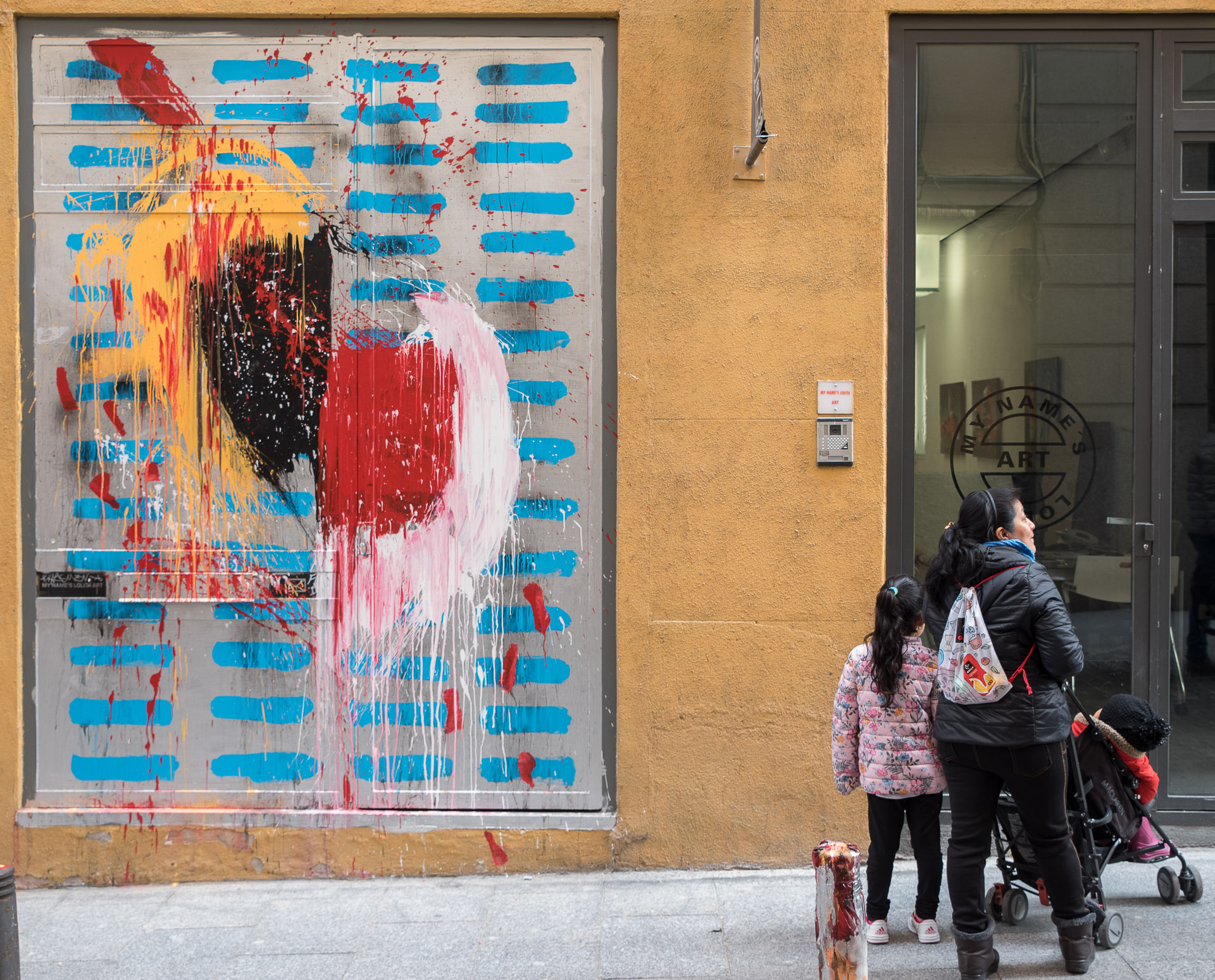 Unos vecinos a punto de entrar en su casa, que se ha convertido en un soporte para el arte moderno.