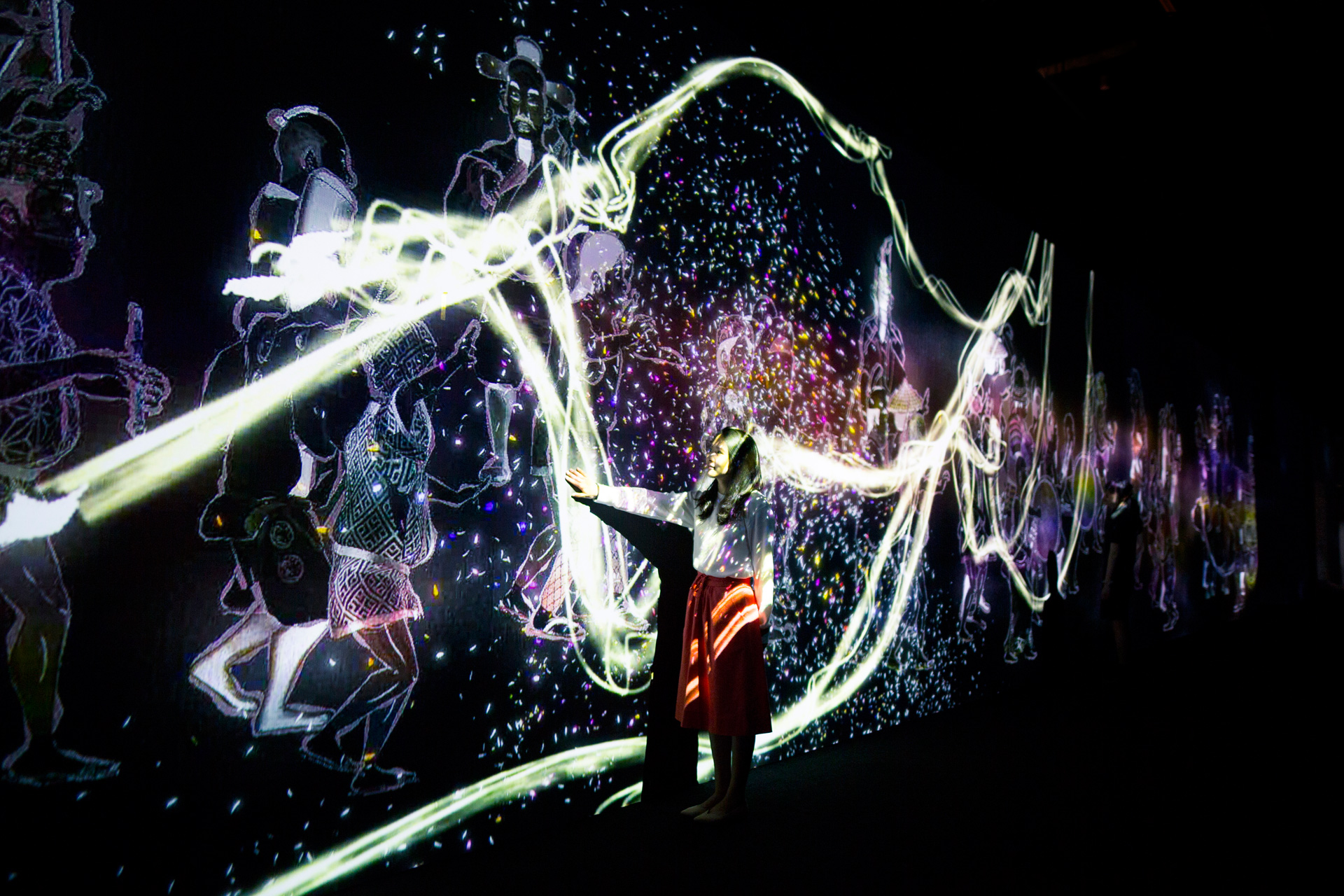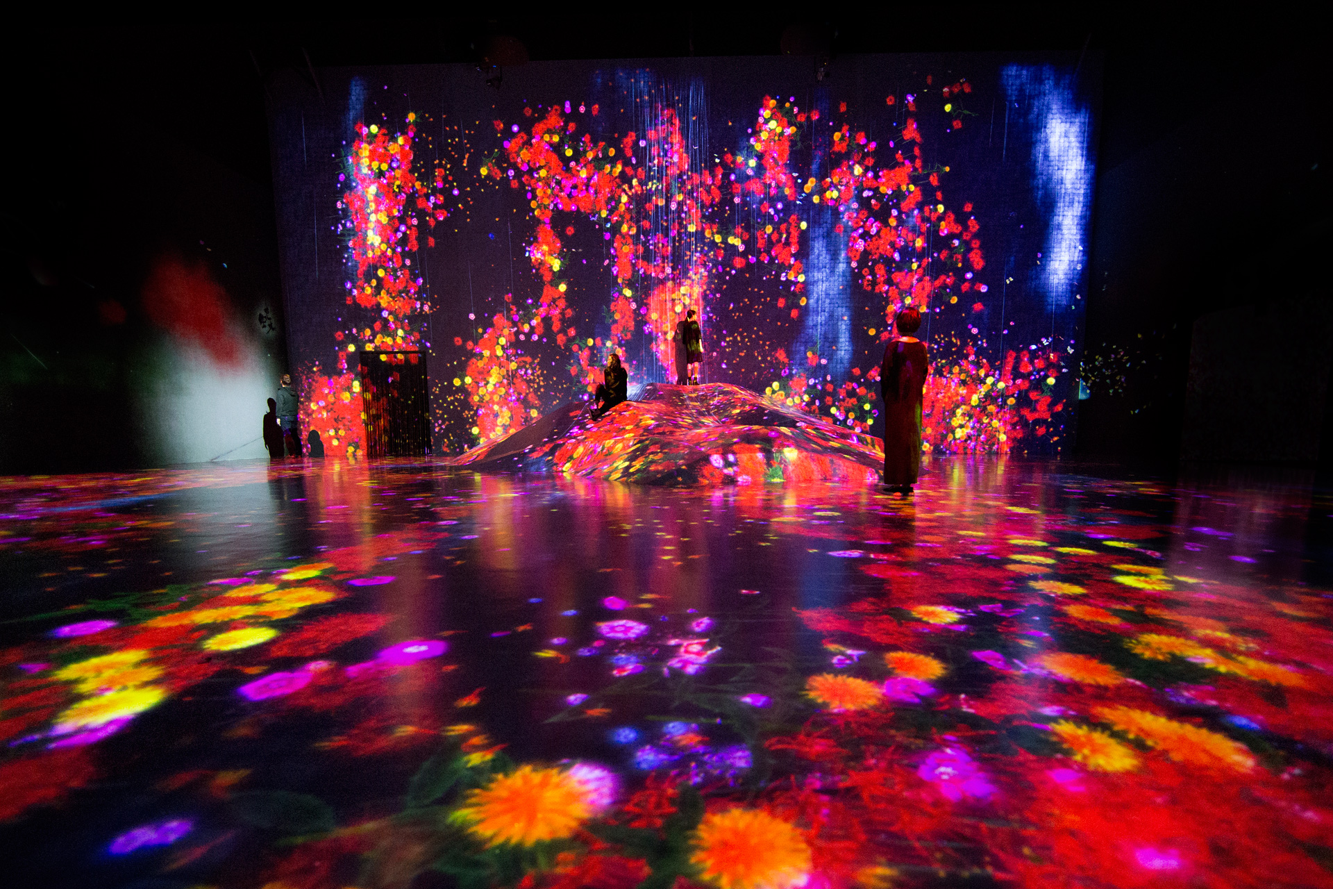 Una de las salas del museo de arte digital donde los visitantes se funden con el entorno proyectado.