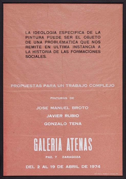 Cartel de la primera exposción del grupo. Autores: Grupo de Trama (José Manuel Broto; Xavier Grau; Federico Jiménez Losantos; Javier Rubio; Gonzalo Tena). Año 1974. Depósito temporal Colección Javier Lacruz, Zaragoza, 2012
