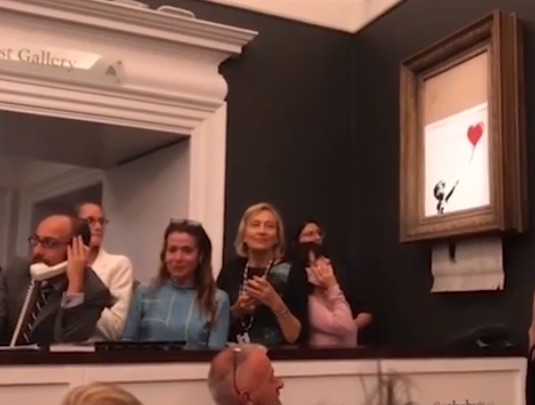 El propio creador difundió un vídeo en la red social Instagram en el que explica cómo planeó la autodestrucción de Girl With Balloon (Niña con globo). La obra se hizo trizas al pasar por una trituradora de papel instalada en la parte inferior del marco.