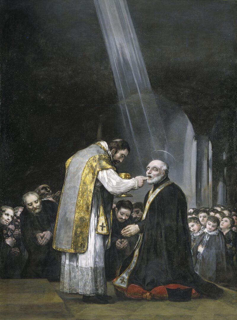 La última comunión de san José de Calasanz, realizada en 1819 para las Escuelas Pías de Madrid, dos años después del también excepcional cuadro de altar de las Santas Justa y Rufina, para la catedral de Sevilla, cierra la pintura religiosa de Goya, además de ser su última obra pública.