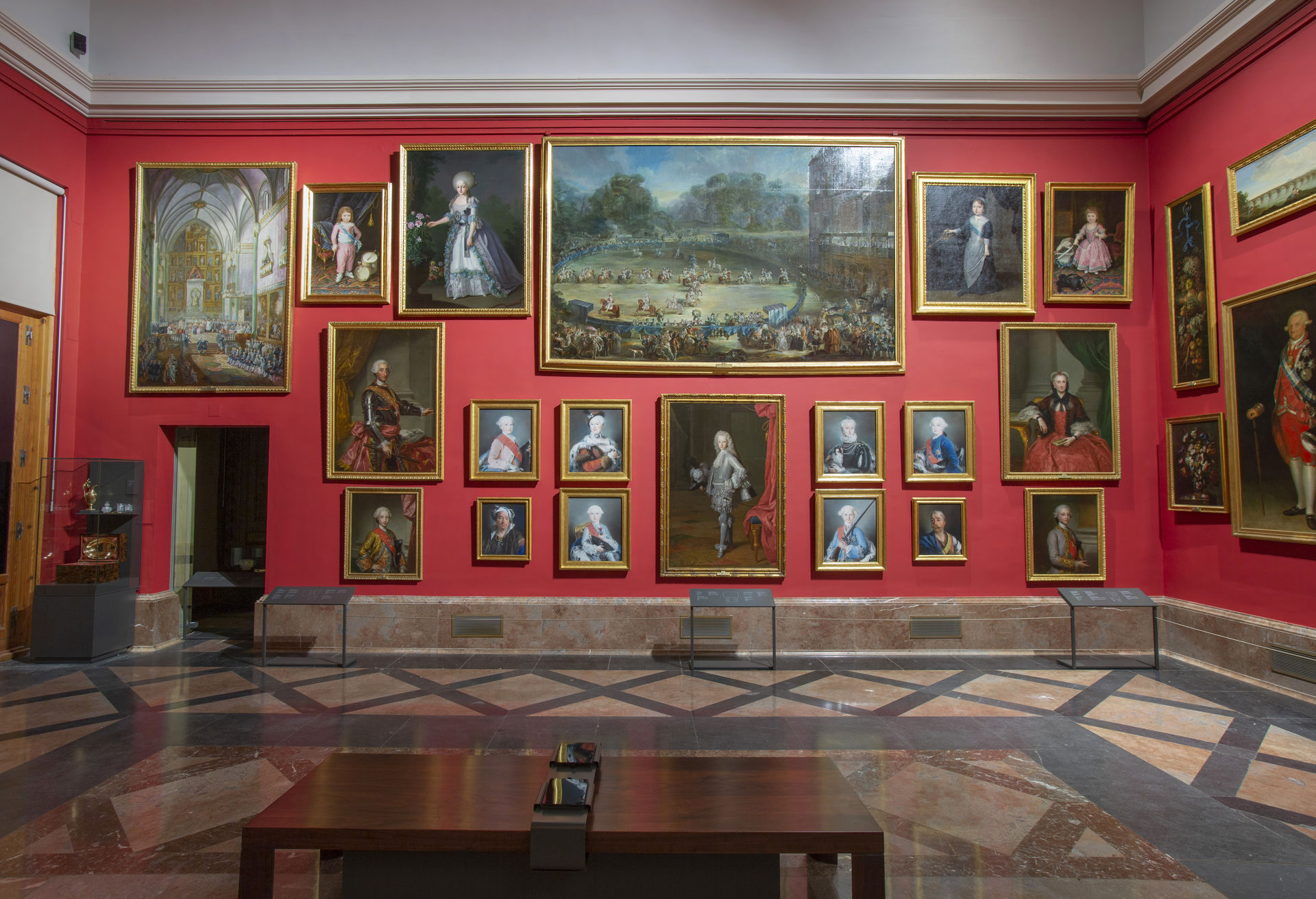 La familia de Carlos IV (1748-1819) estaba representada a través del gran cuadro de Francisco de Goya (expuesto actualmente en la sala 32) y de los retratos individuales de algunos de sus miembros, como los del propio monarca y su esposa María Luisa de Parma. También lo estaban algunos de sus hijos, hermanos de Fernando VII, entre ellos Carlota Joaquina de Borbón -la única obra que posee el Prado del pintor italiano Giuseppe Trono– y María Luisa de Borbón.