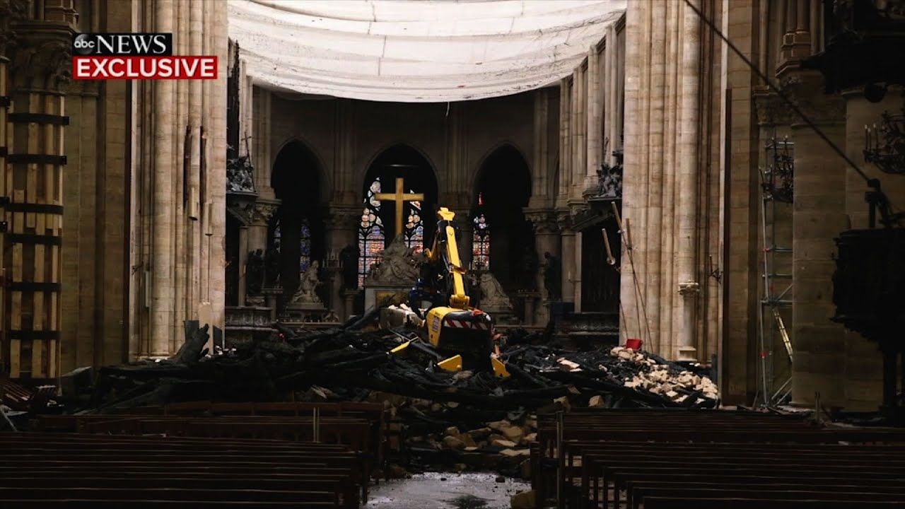Cuando se cumple un mes del devastador incendio que provocó la caída de la cubierta y la aguja de Notre Dame, la cadena ABC News ha tenido acceso al interior del monumento parisino. Por primera vez, podemos ver el estado en el que encuentra la nave central, llena de escombros y fragmentos de madera calcinados. En las imágenes puede verse el enorme agujero en la bóveda fruto de las llamas.