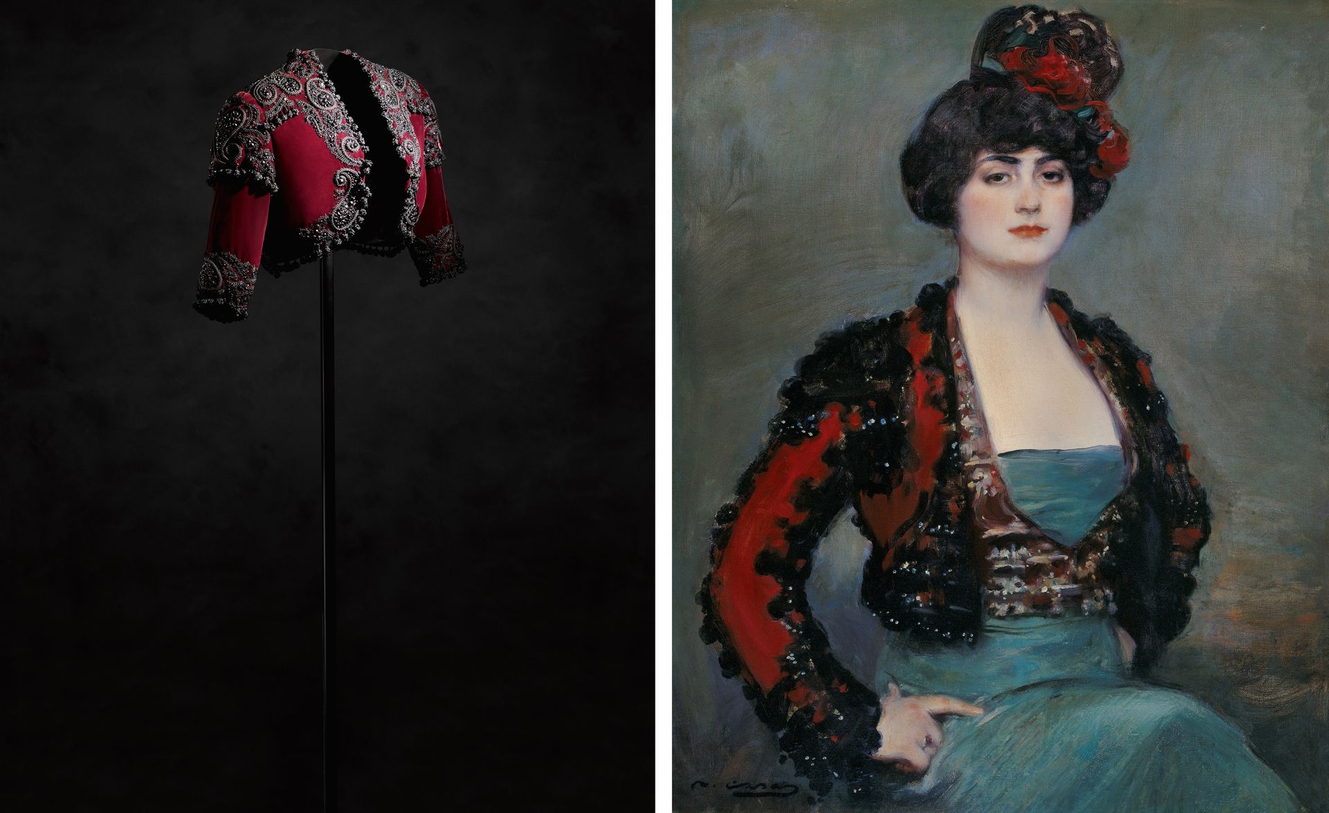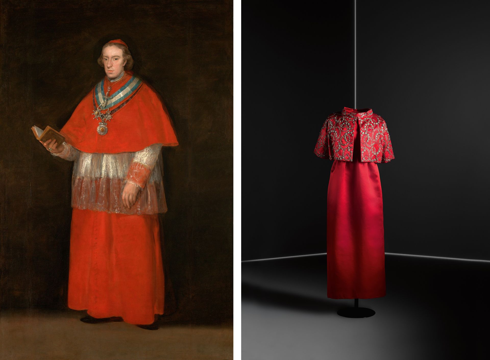 A la izquierda, El cardenal don Luis María de Borbón y Vallabriga (1800), de Francisco de Goya (Museo del Prado). A la derecha, conjunto de vestido y chaqueta de 1960 (Museo del Traje / Jon Cazenave).