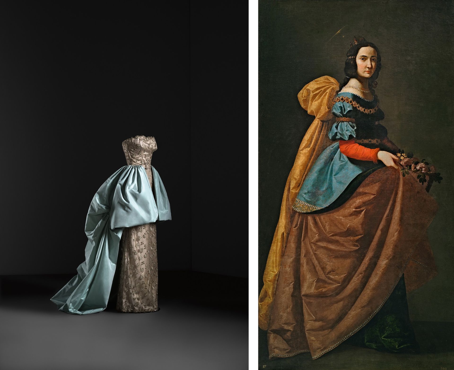 A la izquierda, conjunto de noche de vestido y sobrefalda, hacia 1951. Vestido de tul de algodón bordado con hilo metálico sobre raso de rayón; sobrefalda de tafetán de seda (Museo Cristóbal Balenciaga /Jon Cazenave). A la izquierda, Santa Isabel de Portugal (1635), de Zurbarán (Museo del Prado)