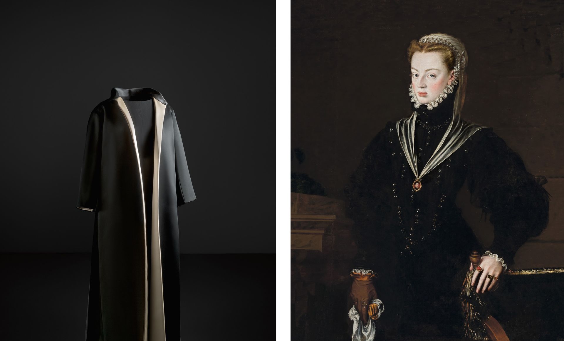 A la izquierda, abrigo de noche reversible de satén de 1966 (Cristóbal Balenciaga Museoa / Jon Cazenave). A la derecha, Retrato de Doña Juana de Austria (1557), de Alonso Sánchez Coello (Museo de Bellas Artes de Bilbao)