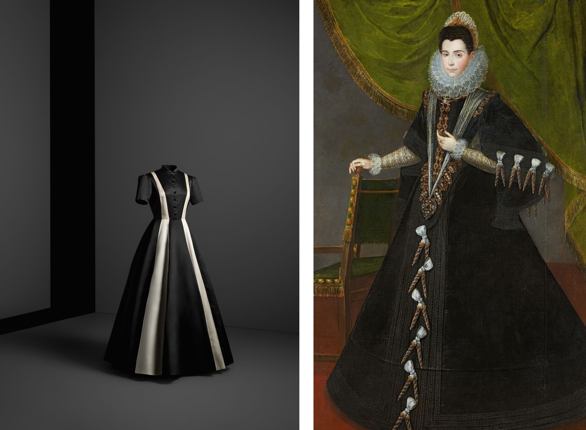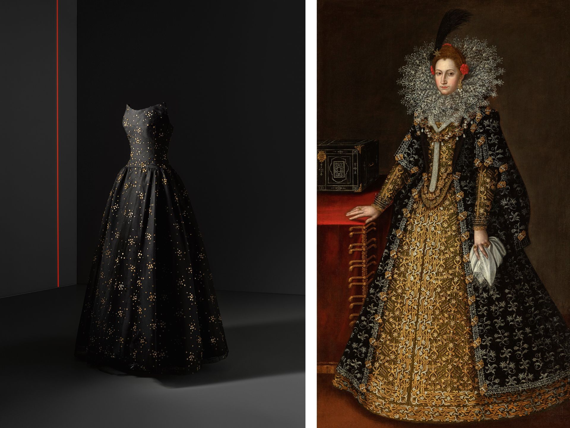 A la izquierda, vestido de noche de seda y purpurina de 1954 (Colección de Dominique Sirop / Jon Cazenave). A la derecha, Retrato de dama (1600), atribuido a Rodrigo de Villandrando (Museo Lázaro Galdiano).