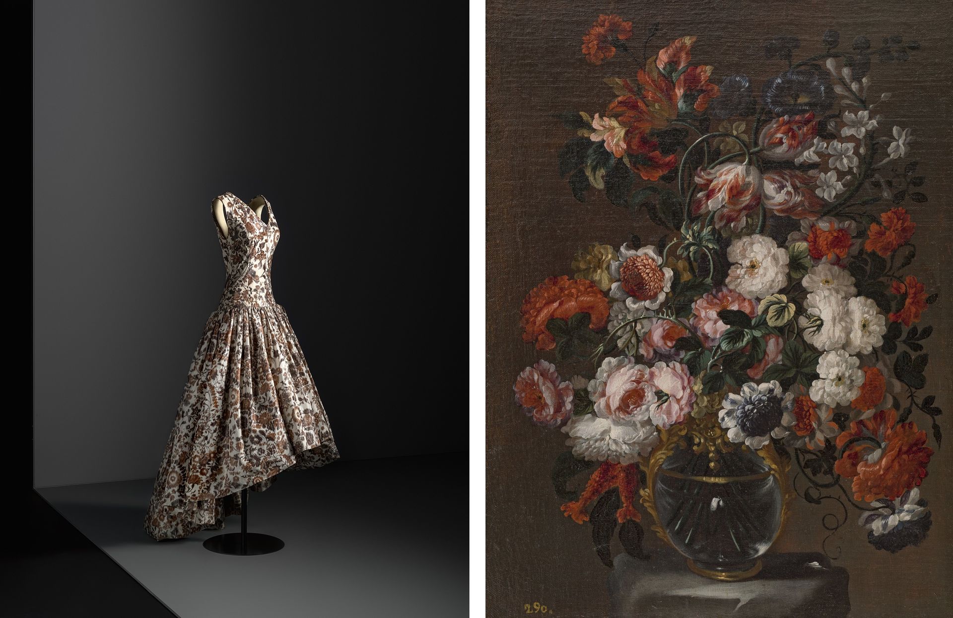 A la izquierda, vestido de noche ikat de seda de 1958 (Colección de Inés Carvajal / Jon Cazenave). A la derecha, Jarrón de cristal con flores (segunda mitad del siglo XVII), de Gabriel de la Corte (Coleccion Gerstenmainer)