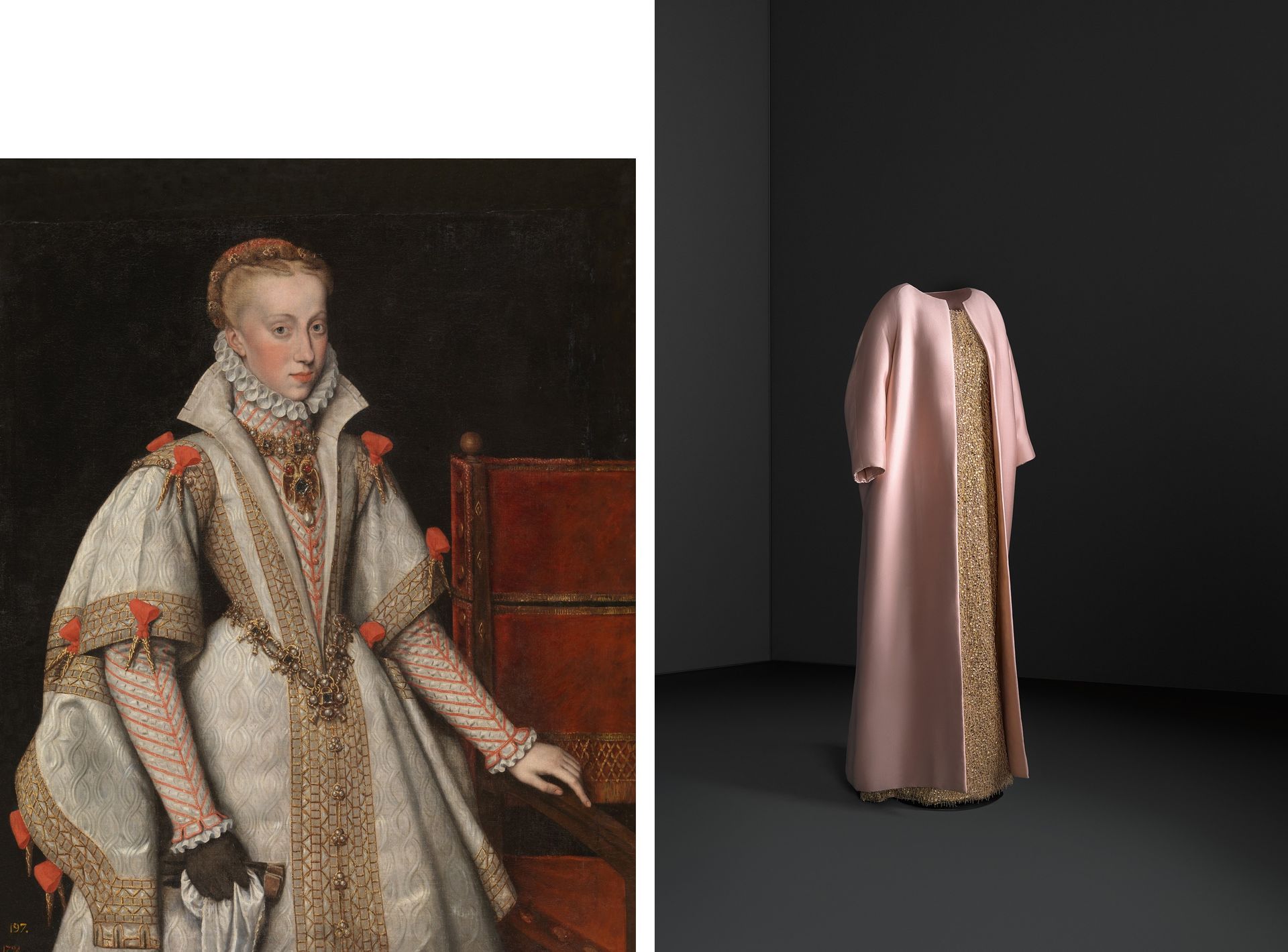 A la izquierda, La reina Ana de Austria, cuarta esposa de Felipe II (1616), de Bartolomé González y copia de Moro (Museo del Prado). A la derecha, conjunto de noche de abrigo y vestido de 1962 (Cristóbal Balenciaga Museoa / Jon Cazenave)