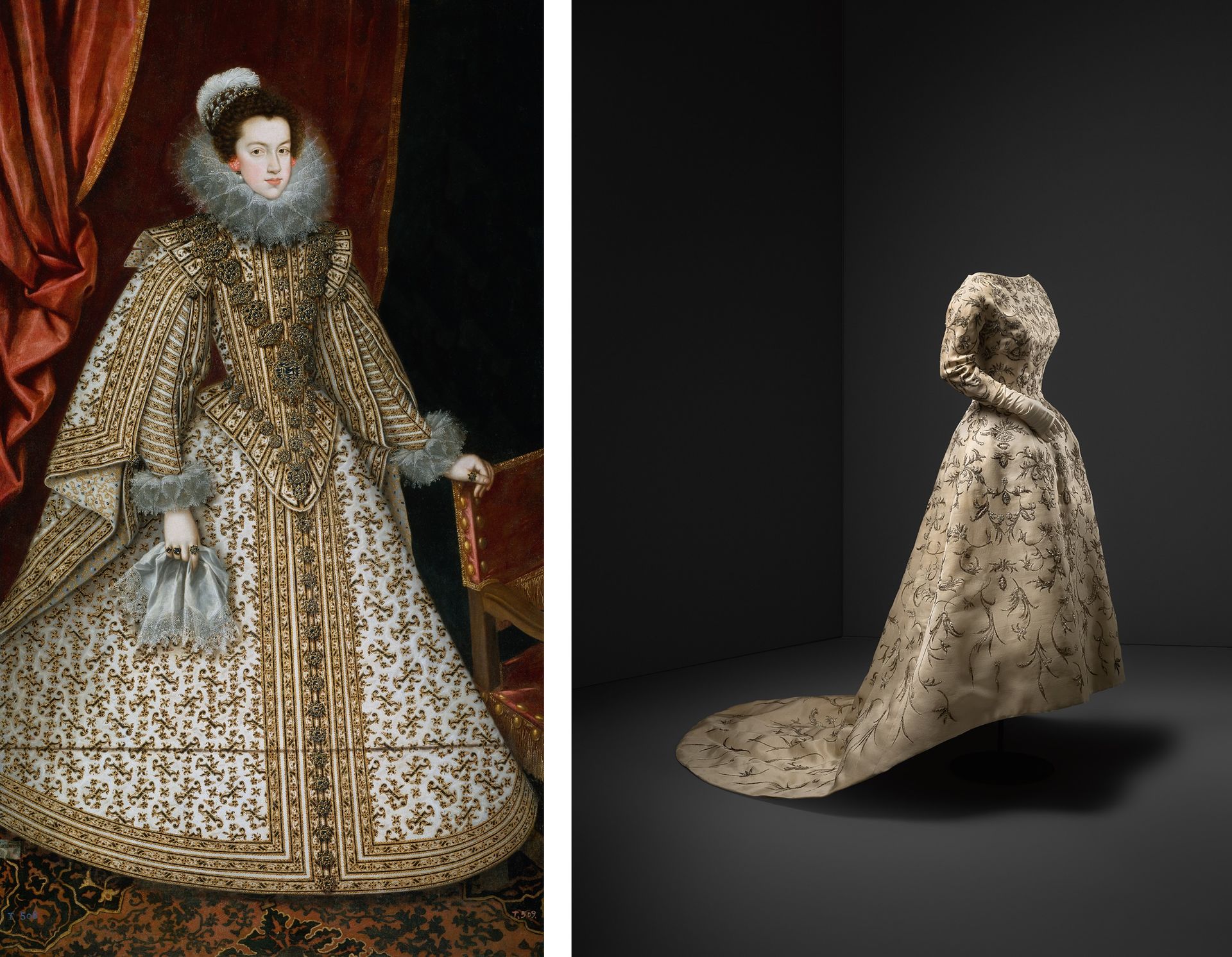 A la izquierda, Isabel de Borbón esposa de Felipe IV (1620), de Rodrigo de Villandrando (Museo del Prado). A la derecha, vestido de novia de 1957 (Museo Cristóbal Balenciaga/ Jon Cazenave).