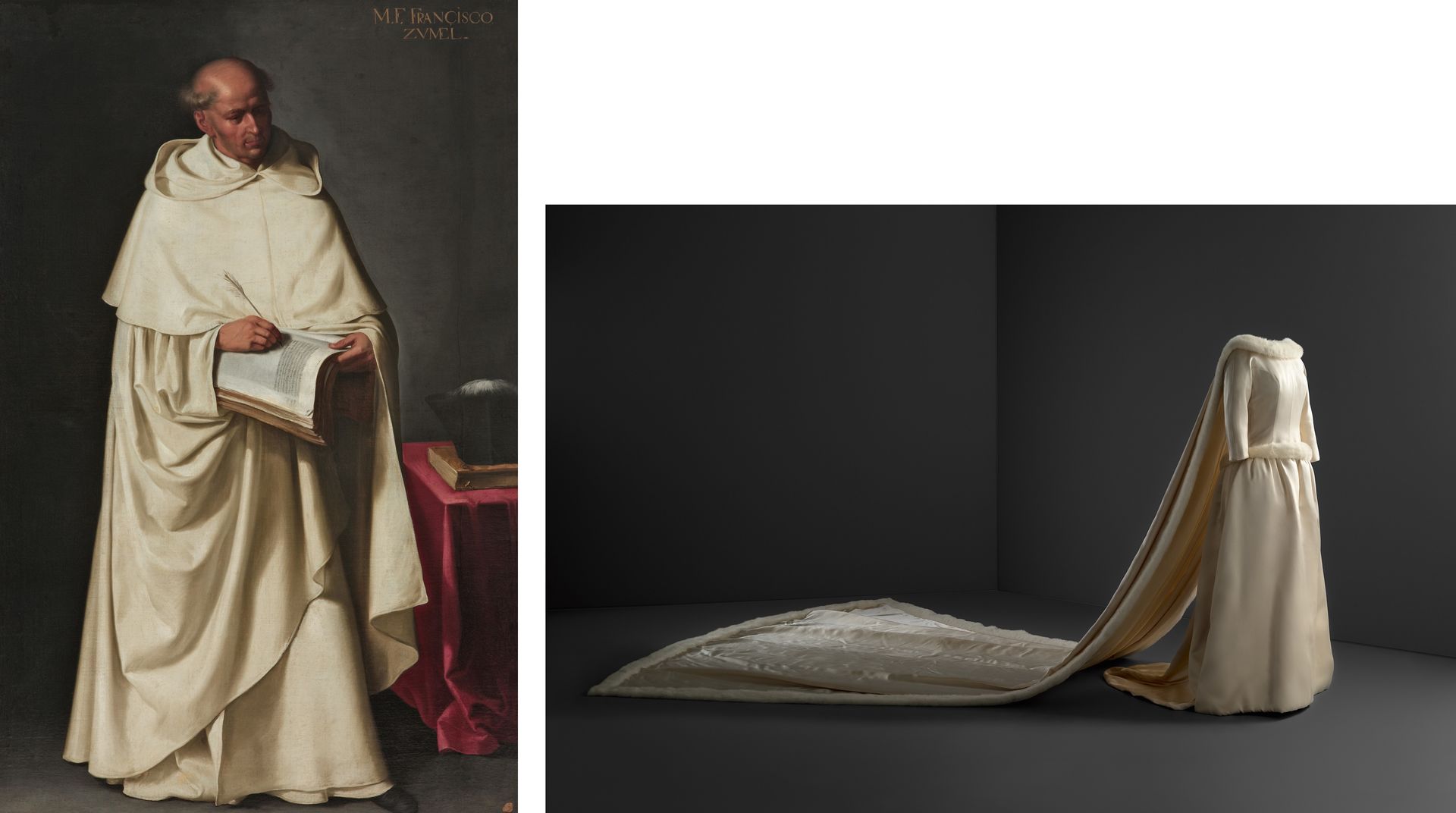 A la izquierda, Fray Francisco Zúmel (1628), de Francisco Zurbarán (Real Academia de Bellas Artes de San Fernando). A la derecha, vestido de novia de satén y visón, de 1960 (Museo Cristóbal Balenciaga/ Jon Cazenave)