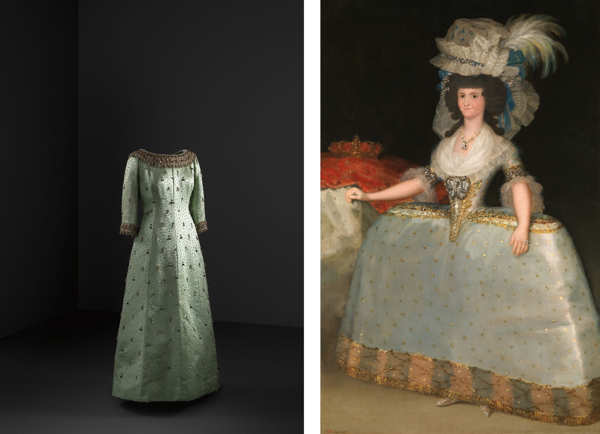 A la izquierda, vestido de noche de satén, perlas y abalorios, de 1963 (Museo Cristóbal Balenciaga / Jon Cazenave). A la derecha, La reina María Luisa con tontillo (1789), de Francisco de Goya (Museo del Prado)
