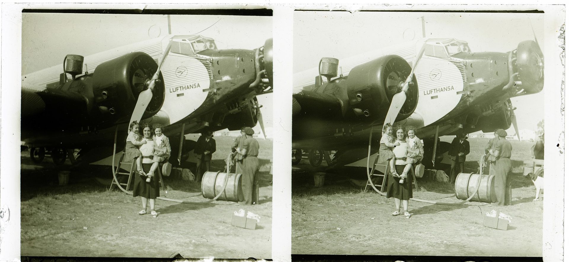 En esta imagen estereoscópica, una mujer con sus hijos en brazos se fotografía delante de un Junkers Ju-52 de Lufthansa, posiblemente en Barcelona a principios de los años 40. La visión estereoscópica, que permite la percepción de la profundidad del mundo real, aparece descrita por primera vez en 1838 en un artículo de Charles Wheatstone. Este descubrimiento pudo aplicarse muy pronto al gran invento de la época, la fotografía. En este mismo principio se basan las gafas 3D o de realidad virtual actuales.