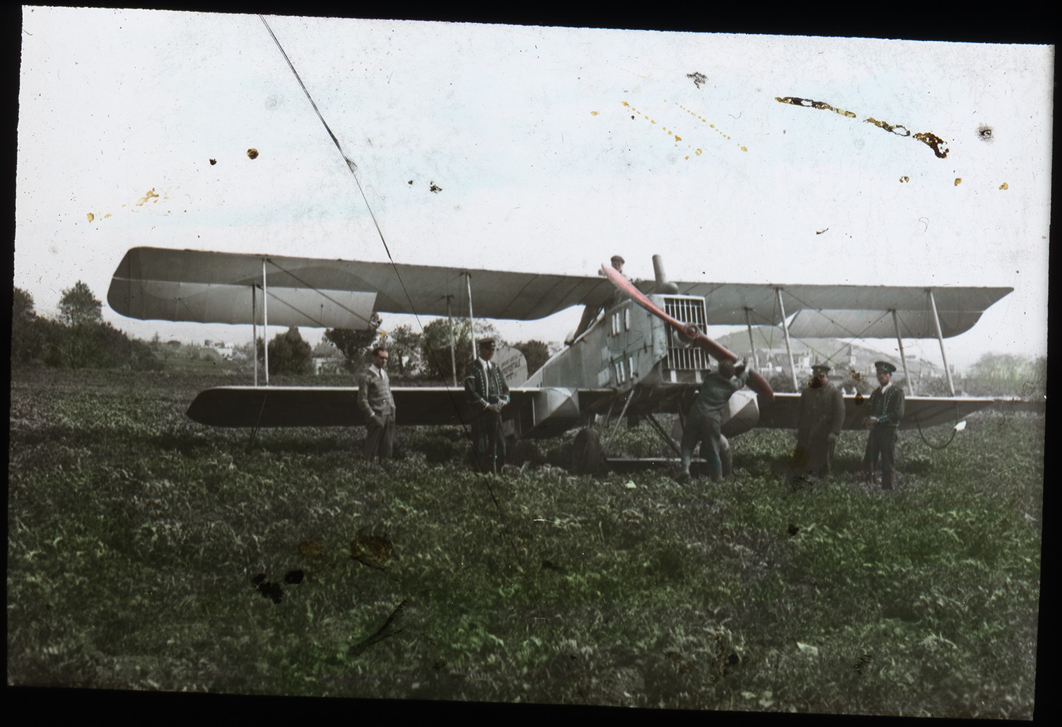 Una rara placa autocroma en color Lumière de un Breguet XIV de la línea aérea Toulouse - Casablanca durante una escala en Barcelona. Comercializadas a partir de 1907, las placas autocromas fueron hasta 1935 la única forma de fotografía en color.
