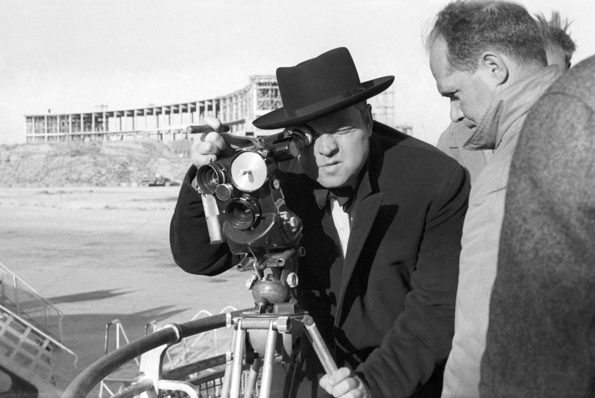 El actor y director Orson Welles durante el rodaje de la película Mr Arkadin en el aeropuerto de Barajas. Al fondo, la Terminal 2 en construcción. Madrid, 27 de febrero de 1954.