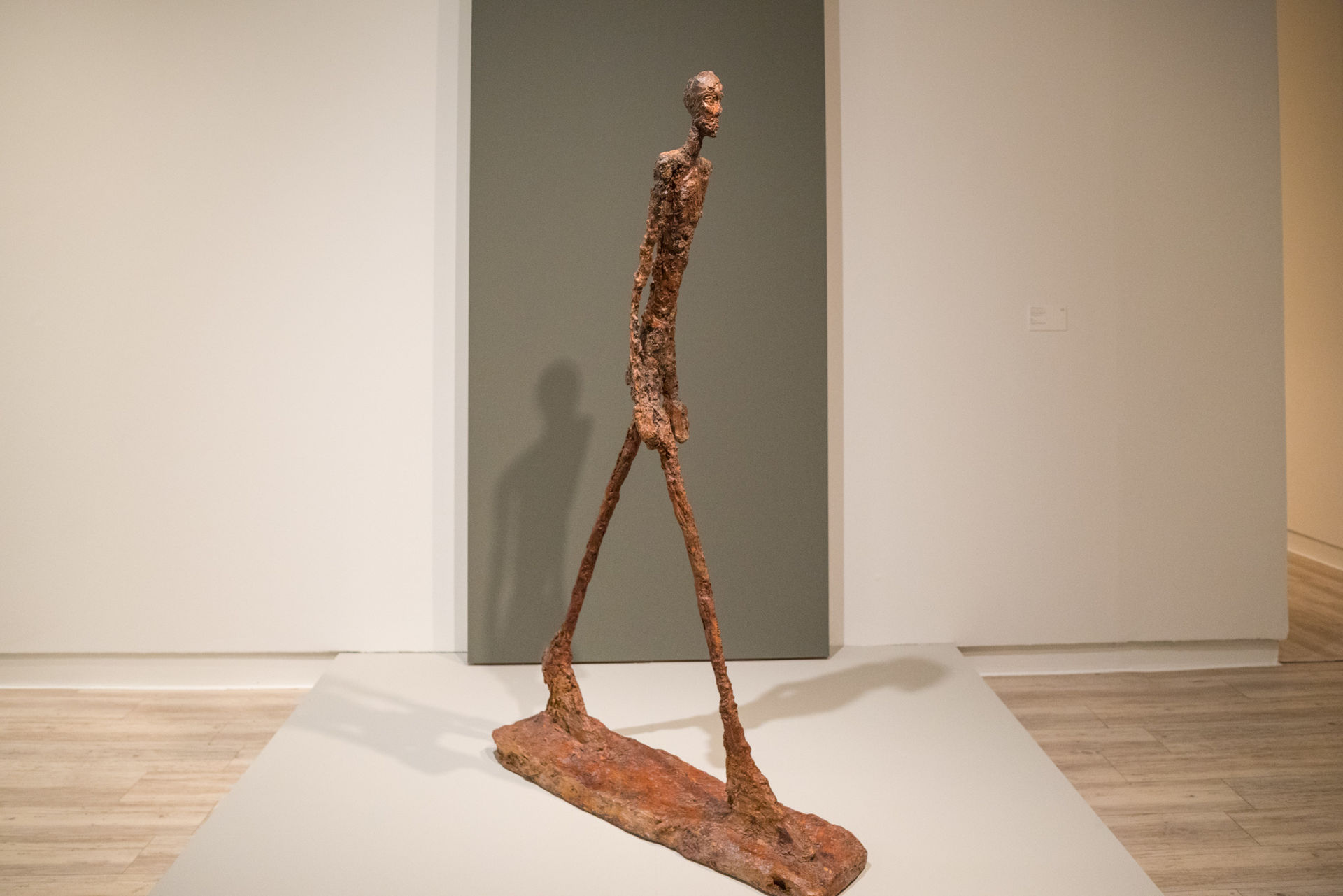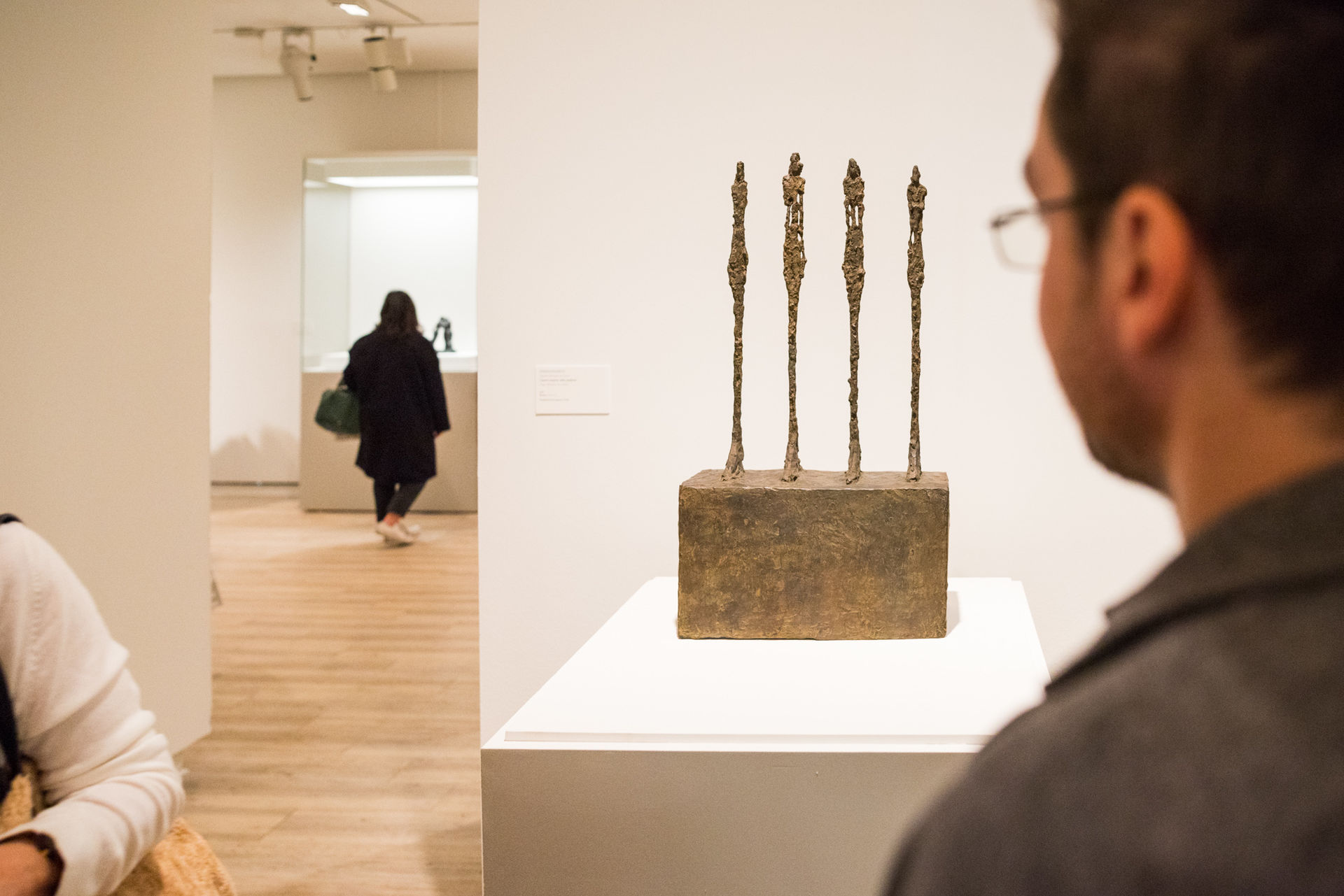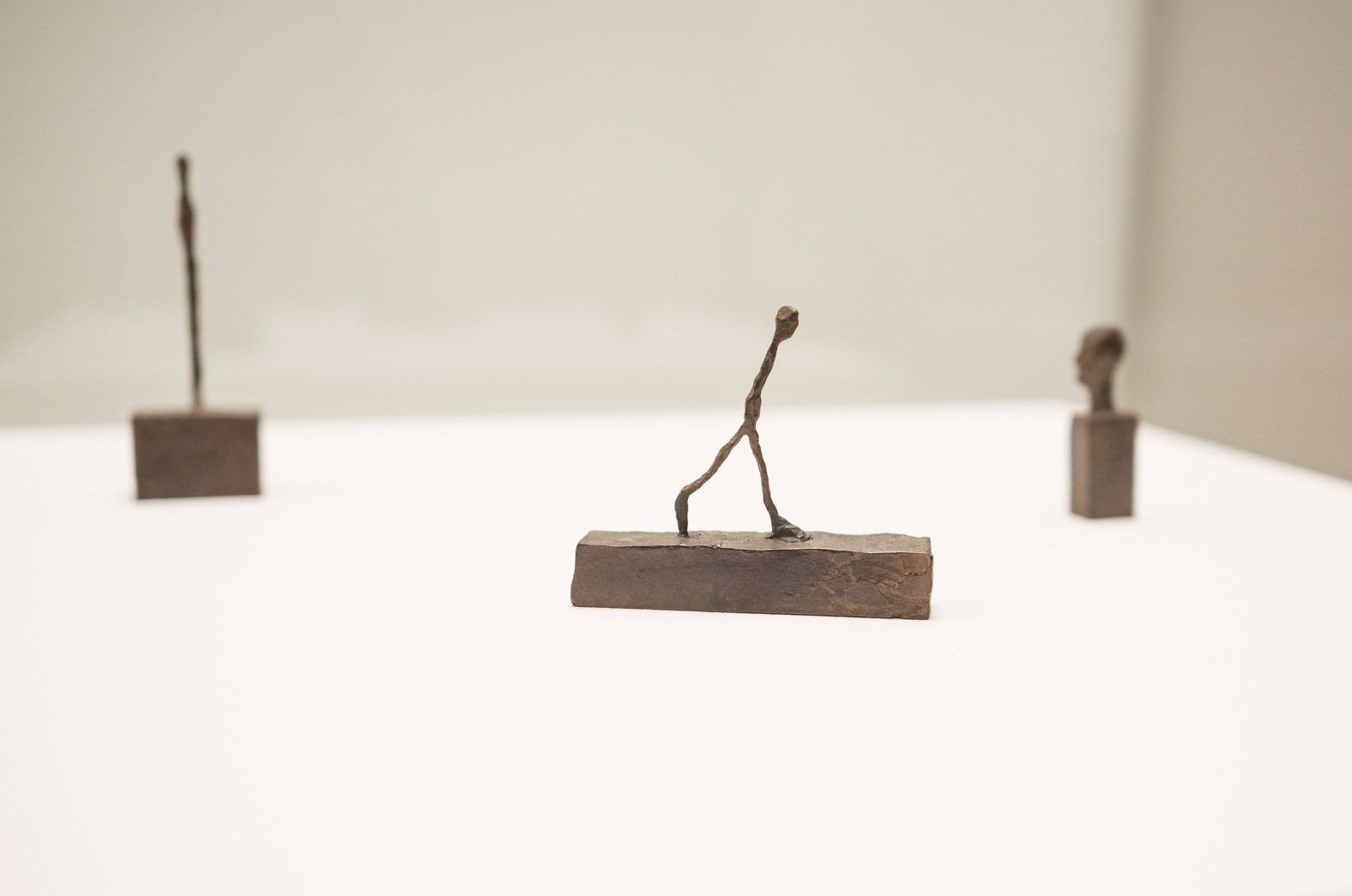 Hombre que camina, mujer de pie y cabeza sobre pedestal, de Alberto Giacometti.