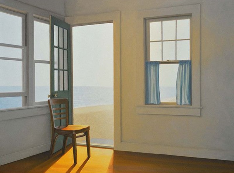 El artista americano Jim Holland sabe cómo crear ese ambiente casi mágico de la luz penetrando por las ventanas. Una sensación de calma y vitalidad que se mezclan, en esta pintura, con la de libertad que nos provoca esa puerta abierta a la playa.
