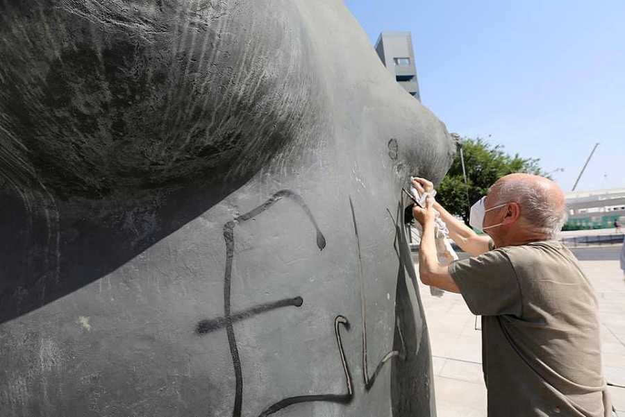 El alcalde de Coslada, Ángel Viveros, informó al pintor y escultor de lo ocurrido, y el propio artista, pincel en mano, restauró de forma altruista la obra, para eliminar de ella el corazón y las tres iniciales que los autores del acto vandálico habían pintado con spray.