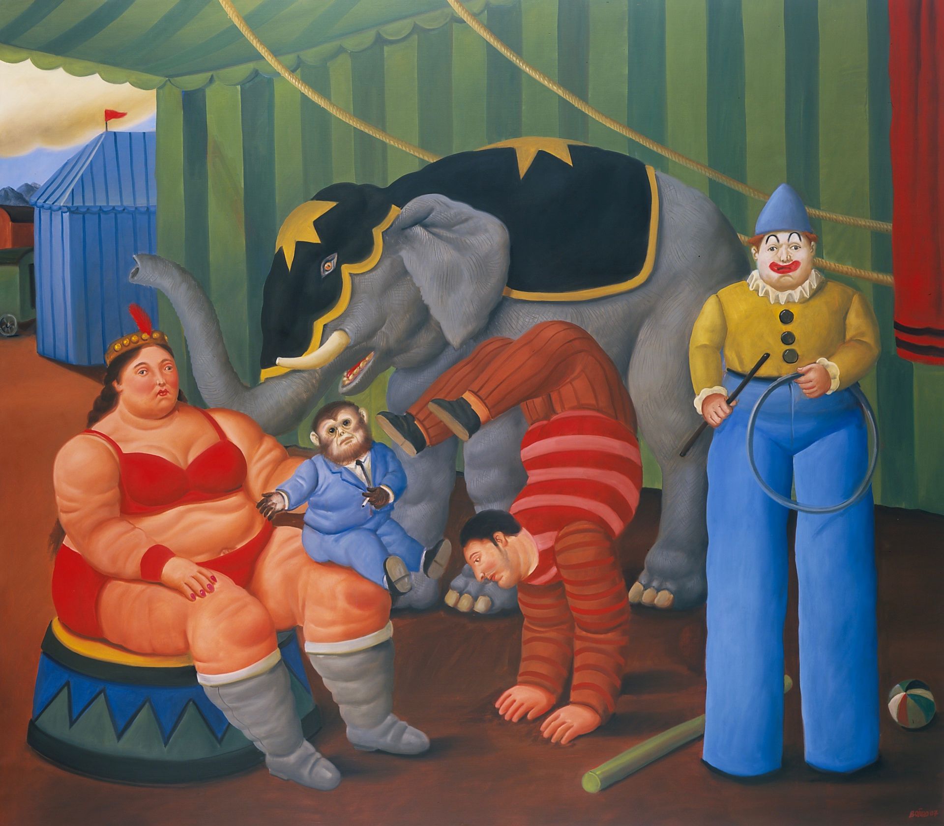 Óleo sobre tela. Picasso, Matisse, Renoir, Degas o Toulouse-Lautrec también exploraron las posibilidades estéticas de los personajes circenses. Botero explora de nuevo el volumen pero los dota de una gran serenidad, generando una paradójica sensación de dinamismo y la quietud.