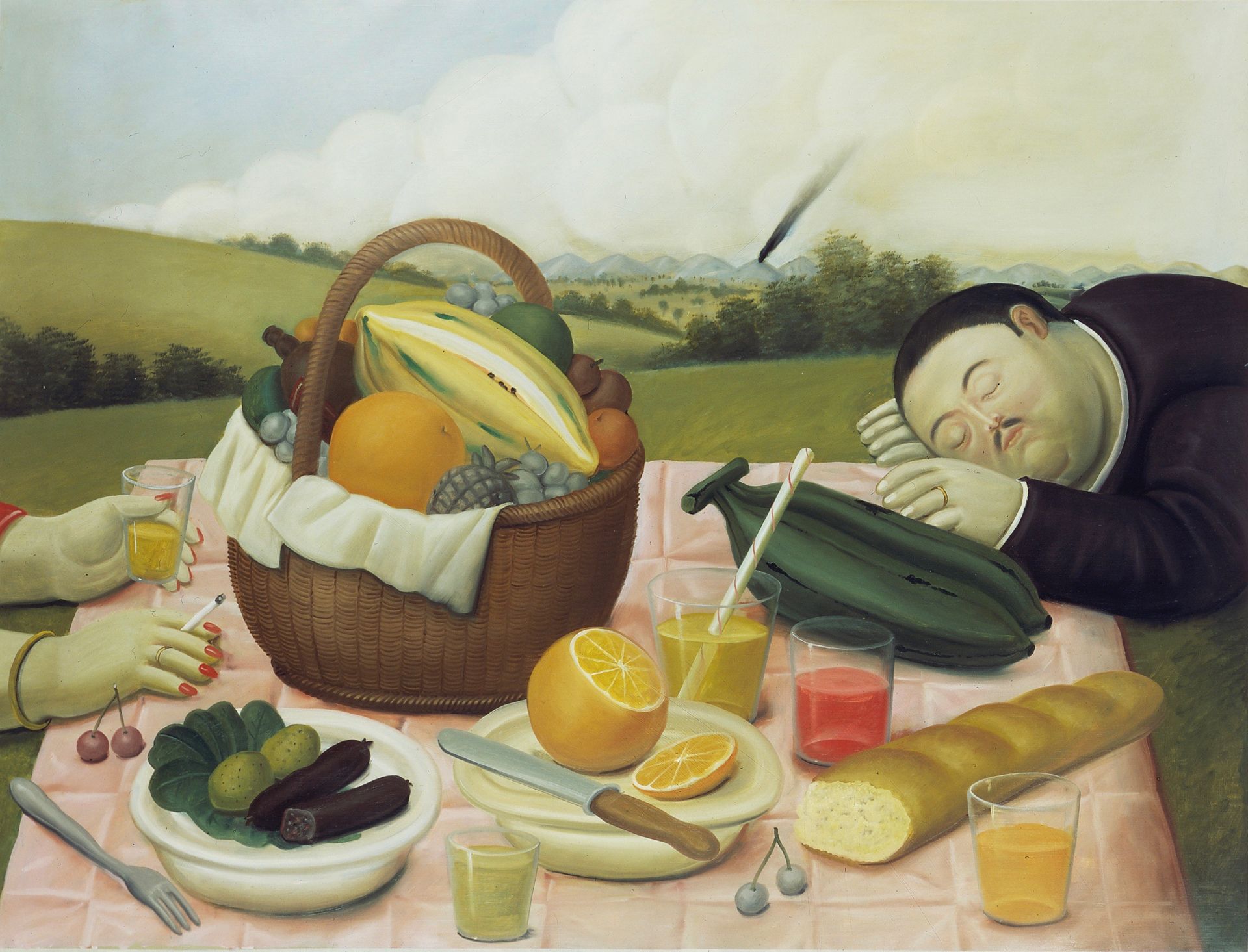 Óleo sobre tela. El mundo de Botero se caracteriza por sus numerosas figuras suntuosas, sensuales y llenas de ternura, inspirado en una América Latina nostálgica, en sus tradiciones, en su exageración, en el barroco del estilo colonial y en la pureza de las formas del arte precolombino.