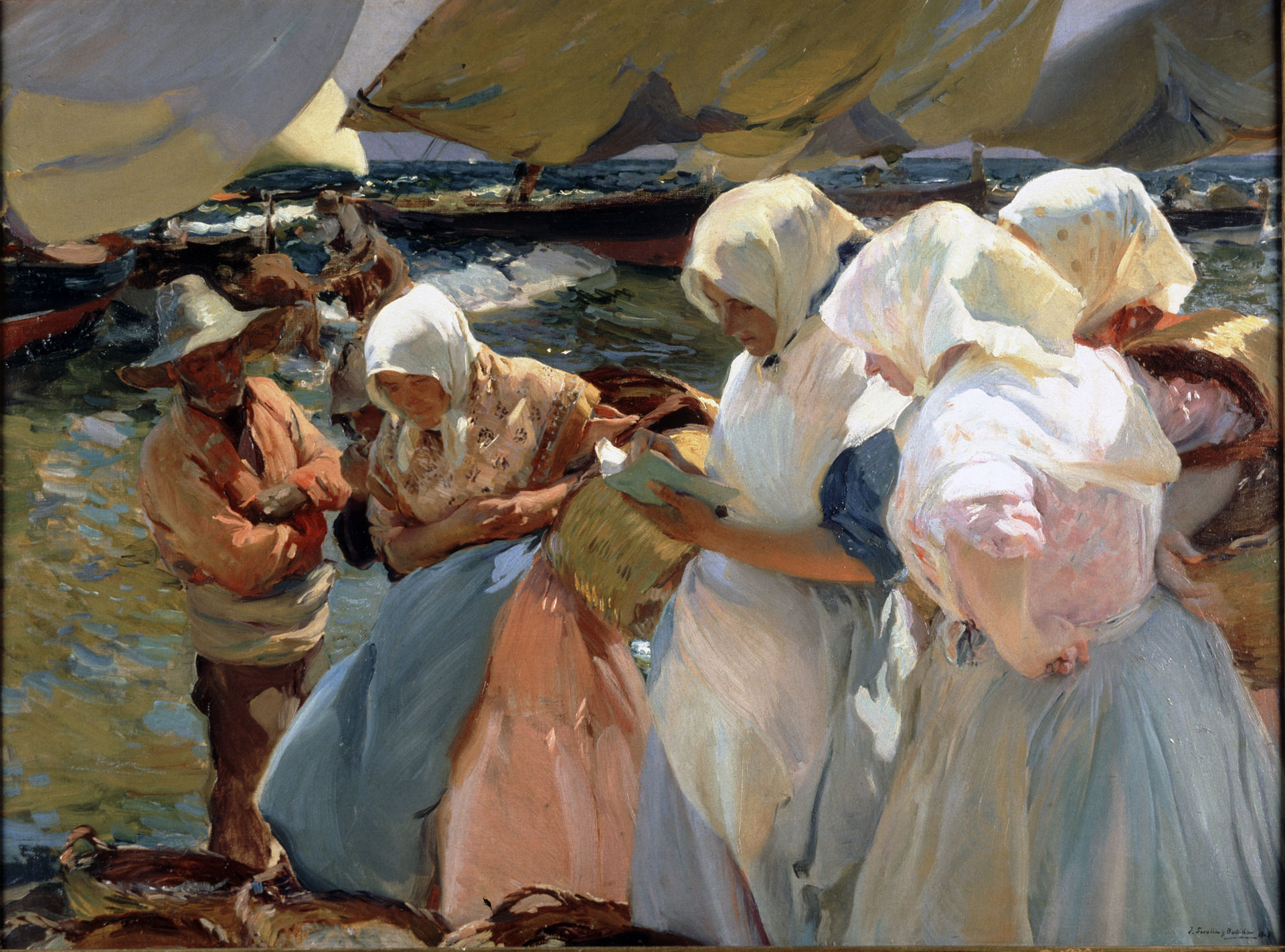 El mar es una constante en la producción de Sorolla. El artista retrató junto a él a unas peculiares heroínas, las pescadoras valencianas. Figuras fuertes y dignas, que vemos en distintas circunstancias: cuidando de sus hijos en la playa, esperando la llegada de las barcas o portando la pesca del día.