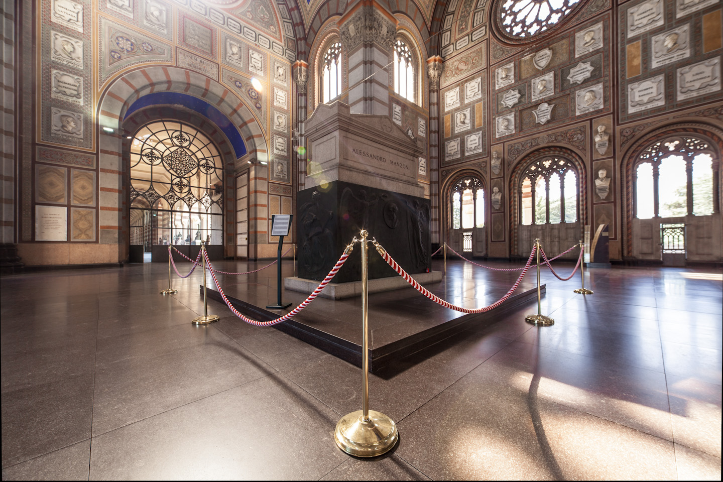 La entrada principal se realiza a través del gran Famedio, un enorme edificio de estilo neomedieval hecho de mármol y piedra que contiene las tumbas de algunos de los ciudadanos más honrados de la ciudad.