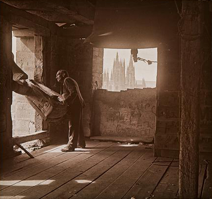 Archivo Villanueva. [Campanero en la torre de la iglesia de San Gil, y al fondo la catedral]. Entre 1913 y 1929.