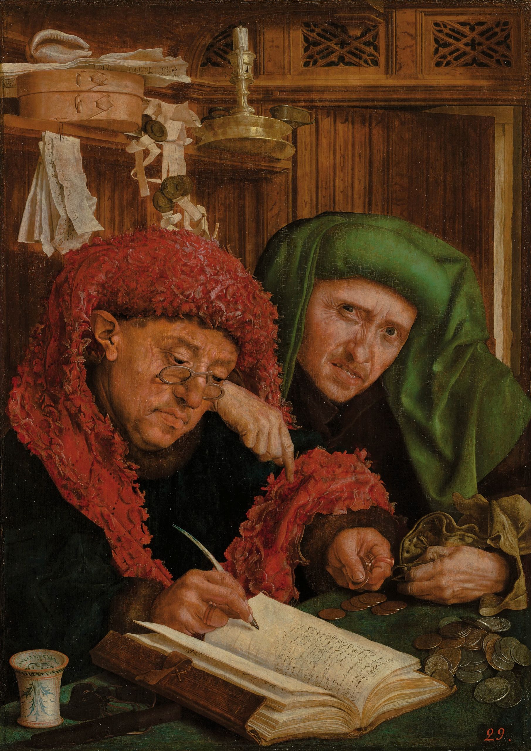 El tesorero municipal (conocido como Recaudadores de impuestos), de Marinus van Reymerswale. Óleo sobre lienzo transferido desde tabla h. 1530 San Petersburgo.